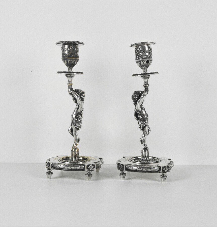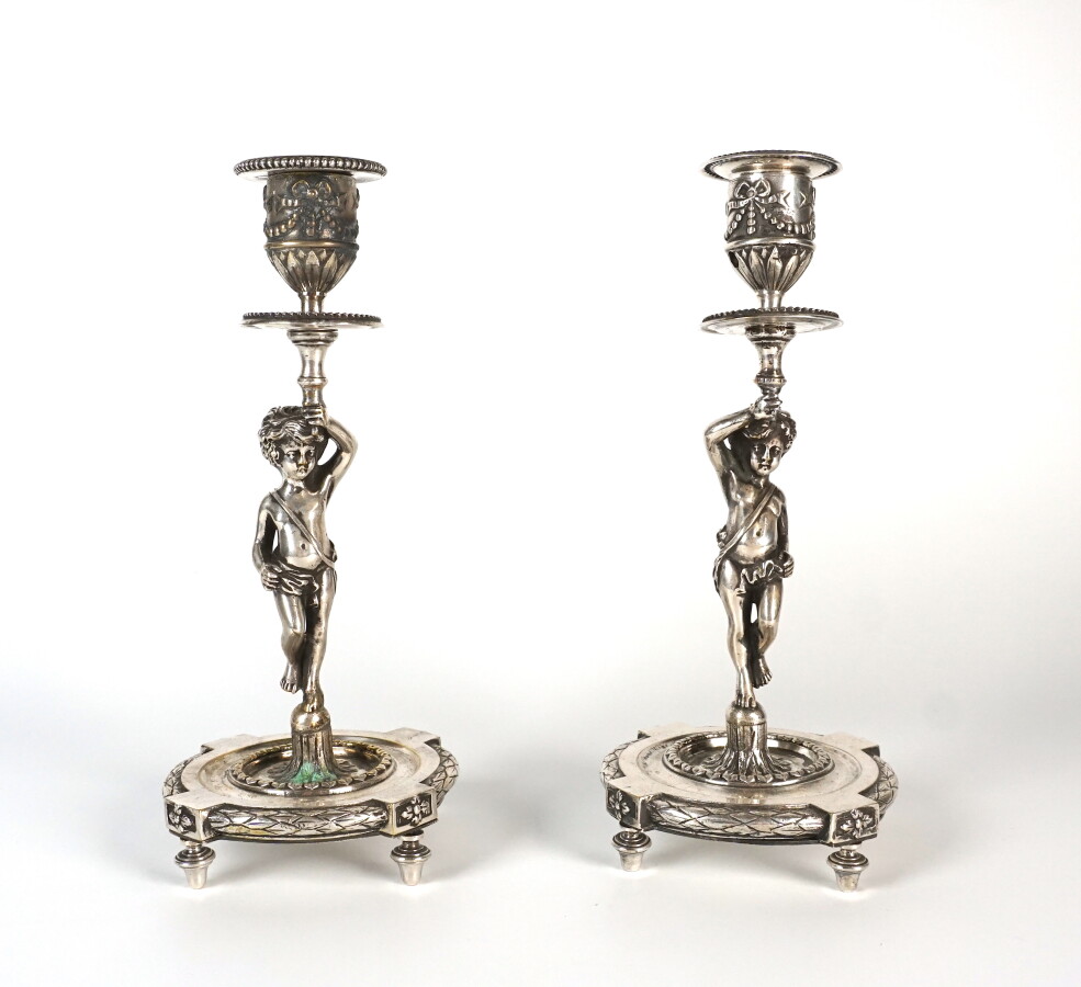 Paire de bougeoirs en métal argenté, figurant de jeunes garçons en équilibre tenant une torche supportant la bobèche à décor de noeuds, les bases circulaires agrémentées de frises feuillagées reposent sur 4 petits pieds, 19e siècle, H. 22.5 cm (oxydations, désargenté).