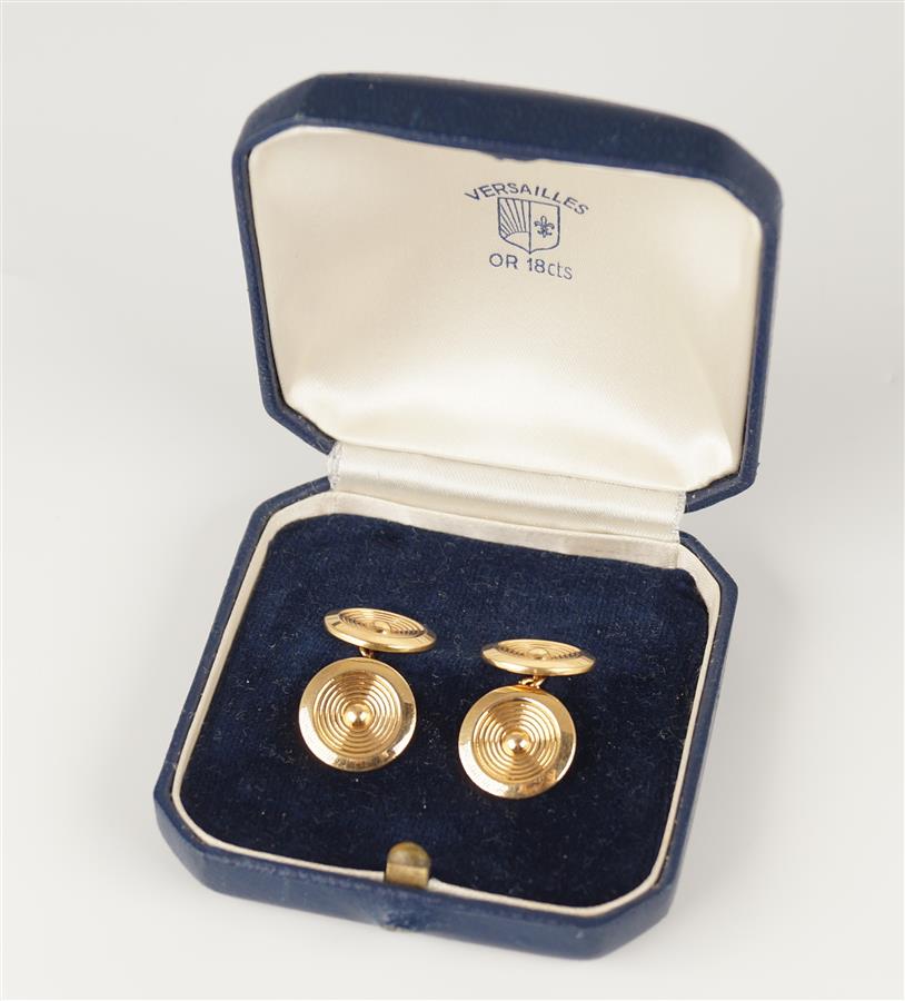 Paire de boutons de manchette circulaires en or jaune 18K (750/oo). Poids brut : 7.9 g environ (dans un écrin).