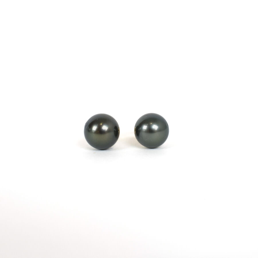 Paire de boutons d'oreilles en or 18K (750/oo) ornée de deux perles de culture de Tahiti de 8.5/9 mm, fermoirs à poussettes belges. Poids brut : 2.60 g.