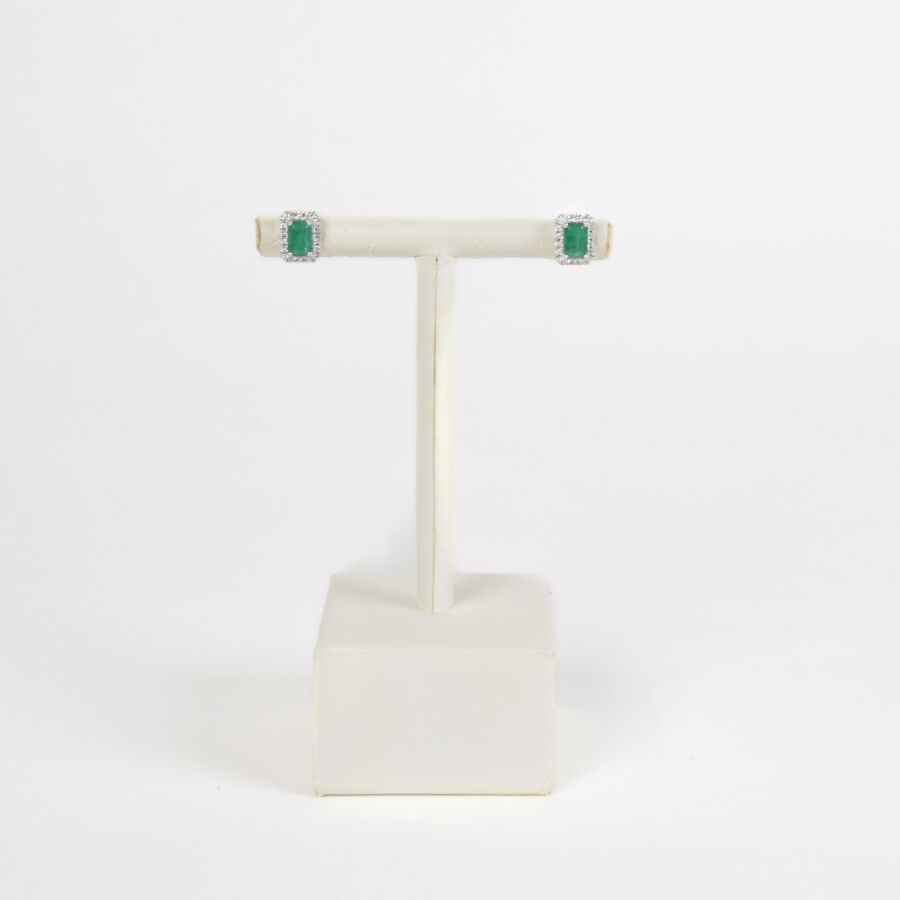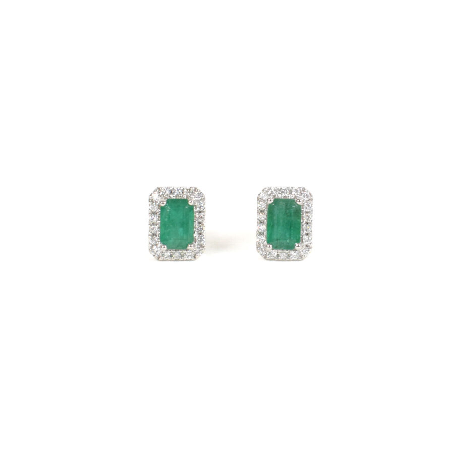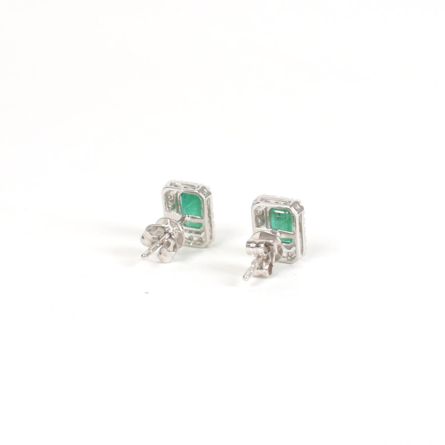Paire de boutons d'oreilles en or blanc 18K (750/oo) ornée d'émeraudes calibrant environ 1.2 ct dans un entourage de diamants pour environ 0.1 ct, fermoirs poussettes belges. Poids brut : 1.80 g.