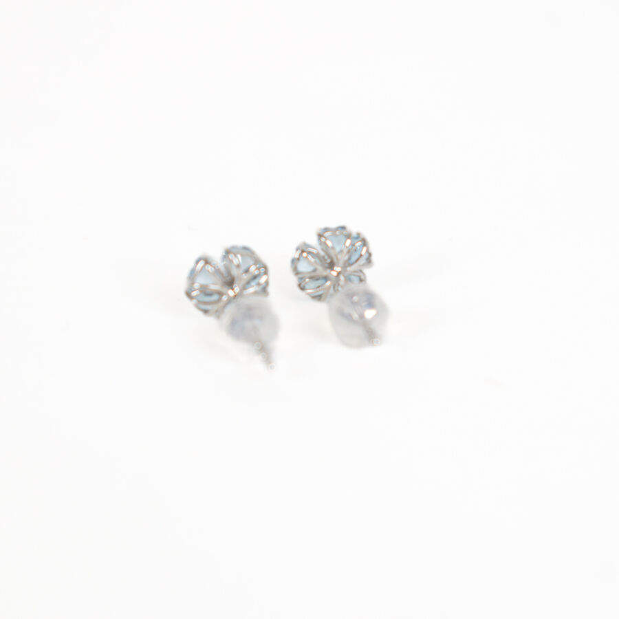 Paire de boutons d'oreilles en or blanc 18K (750/oo) formant des fleurs, ornées en leur centre de deux diamants taille moderne pour environ 0.05 ct, les pétales stylisées de dix aigues-marines taille coeur pour environ 1 ct, fermoirs poussettes belges sous silicones. Dim. 7.5 x 7.5 mm.