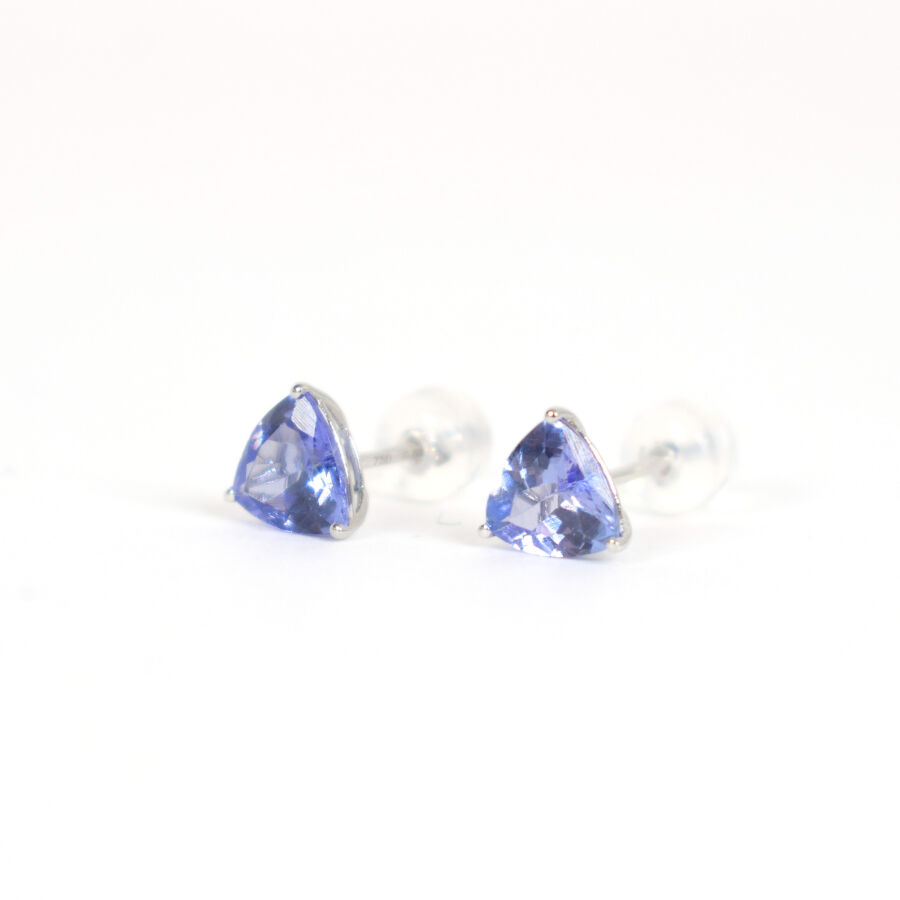 Paire de boutons d'oreilles en or blanc 18K (750/oo), sertie de deux tanzanites taille troïda pour environ 0.7 ct, fermoirs poussettes belges sous silicones. Dim. 6.5 x 6.5 mm. Poids brut : 0.8 g environ.