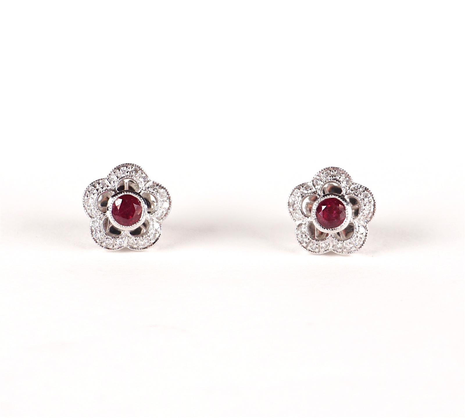Paire de boutons d'oreilles en or gris 18K (750/oo) formant des rosaces centrées de rubis ronds entourés de petits brillants. Poids brut : 3,6 g environ.
