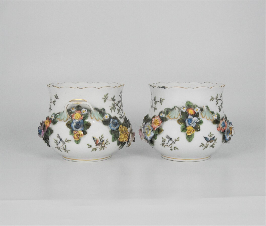 Paire de cache-pots en porcelaine, à décor émaillé polychrome de guirlandes de fleurs en relief et d'oiseaux branchés et d'insectes, rehauts dorés, début du 20e siècle, H. 12,5 cm, D. 12.8 cm (légères usures à la dorure, petits éclats, manque une anse à l'un).