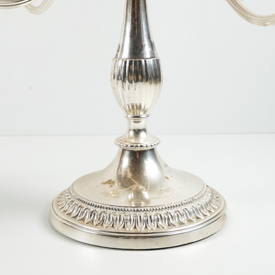 Paire de candélabres en métal argenté à cinq bras de lumière, le socle orné d'une frise feuillagée, porte une étiquette de la marque Viners, production anglaise, H. 32 cm.