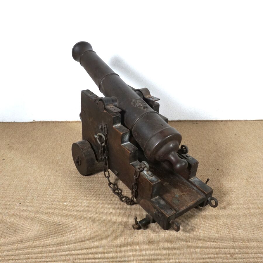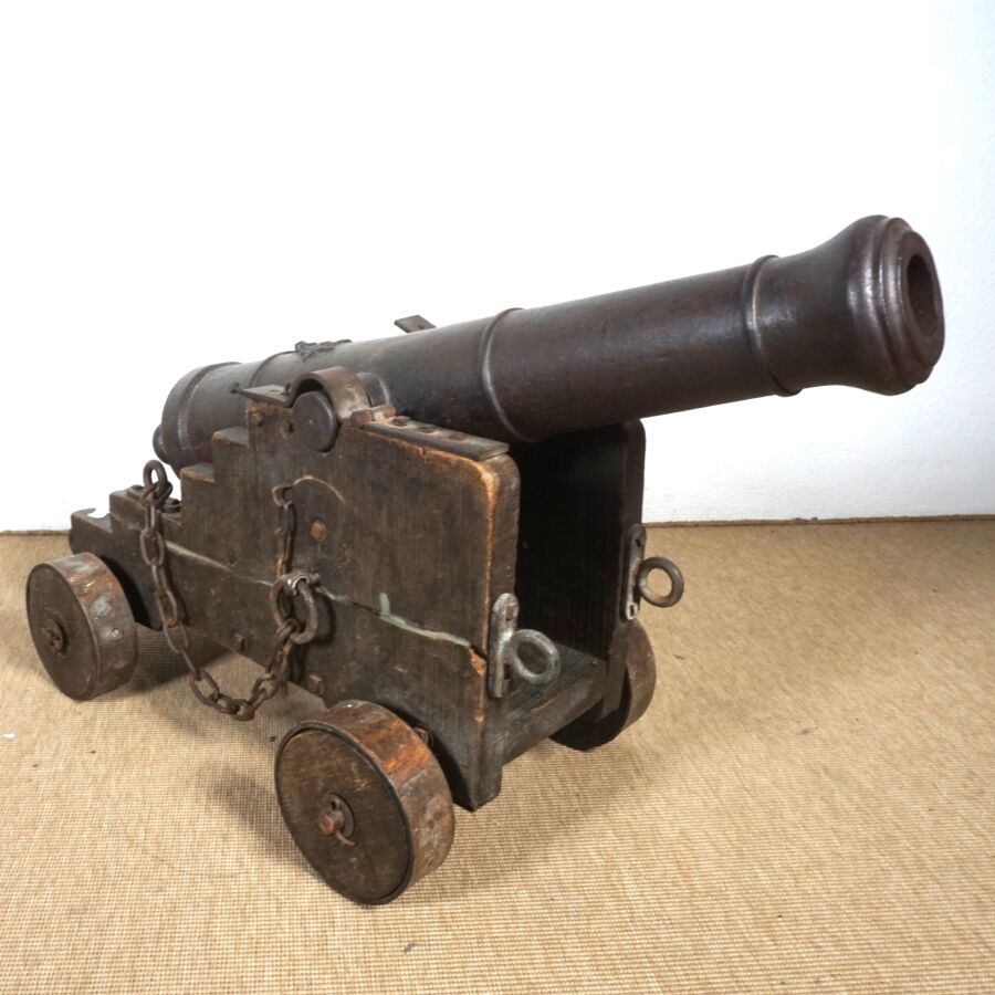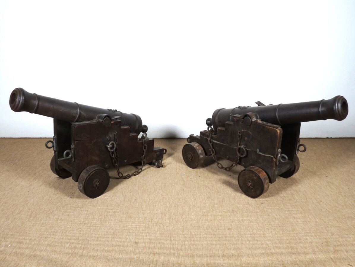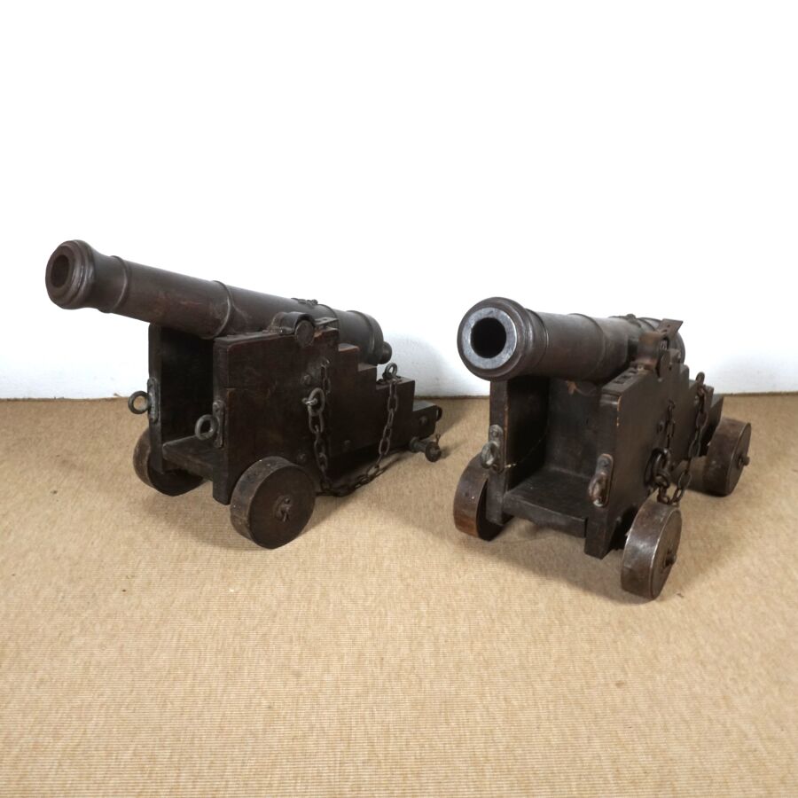 PAIRE DE CANONS A BOURRELETS, longueur des fûts : 80 cm, sur affûts en bois et métal et roues pleines (manque deux roues sur un des affûts), XIXème, BE.