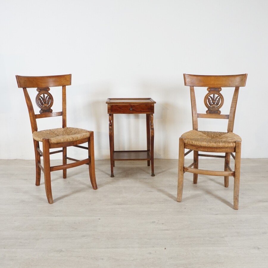 Paire de chaises, bois, assises paillées dossier ajourée à motif d'une palmette, H. 85 cm (en l'état, usures, taches, insolées).