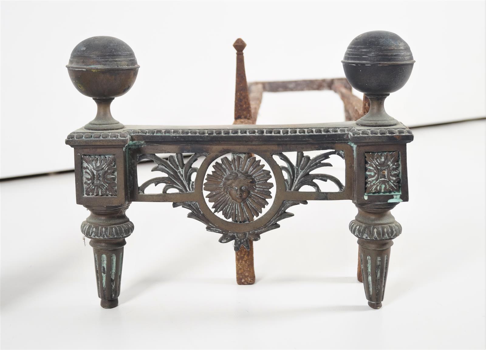Paire de chenets de style Louis XVI en bronze doré pour l'un, l'autre sans patine, pieds cannelés, frises perlées, rosaces et motif central d'un soleil à visage humain, 27 x 54 cm.