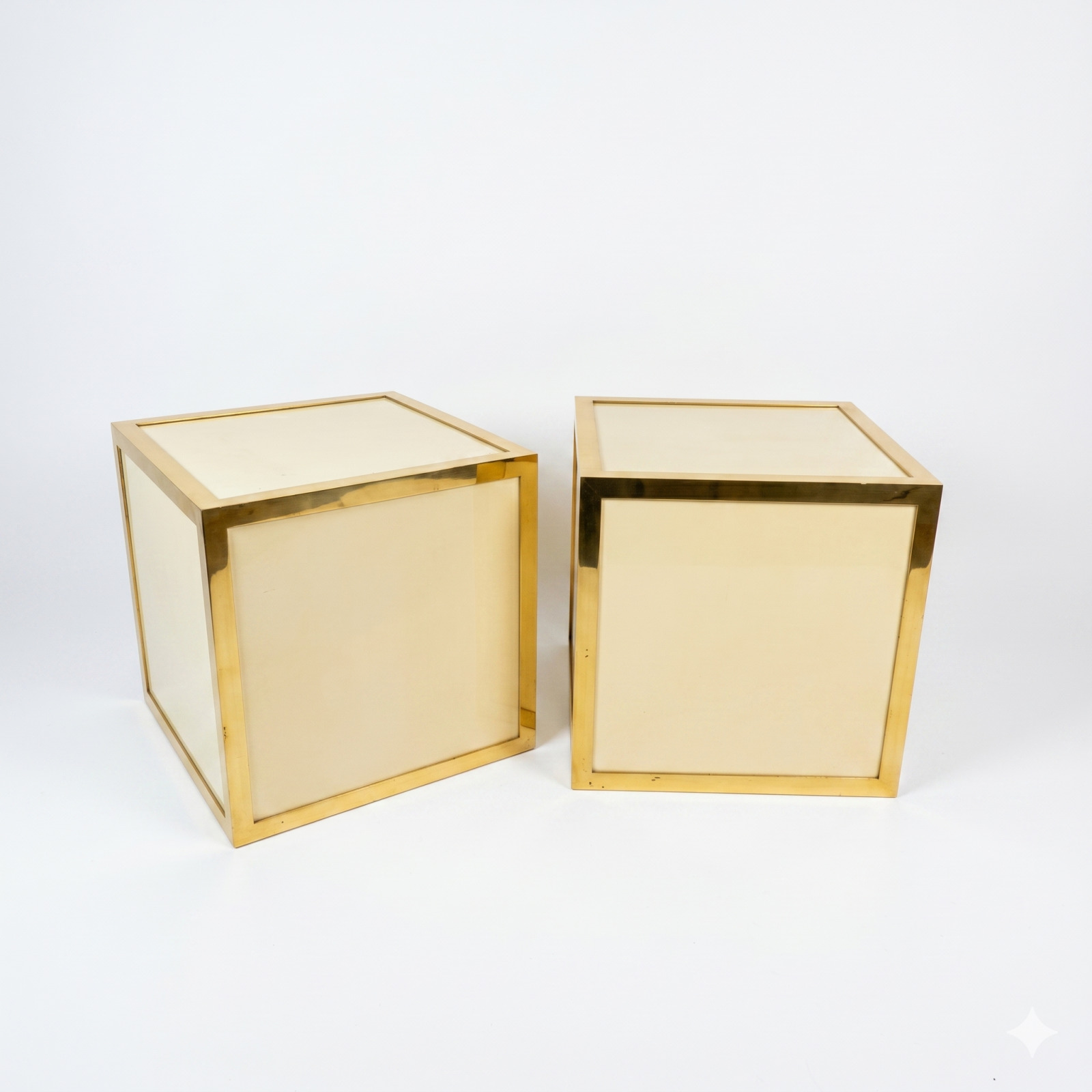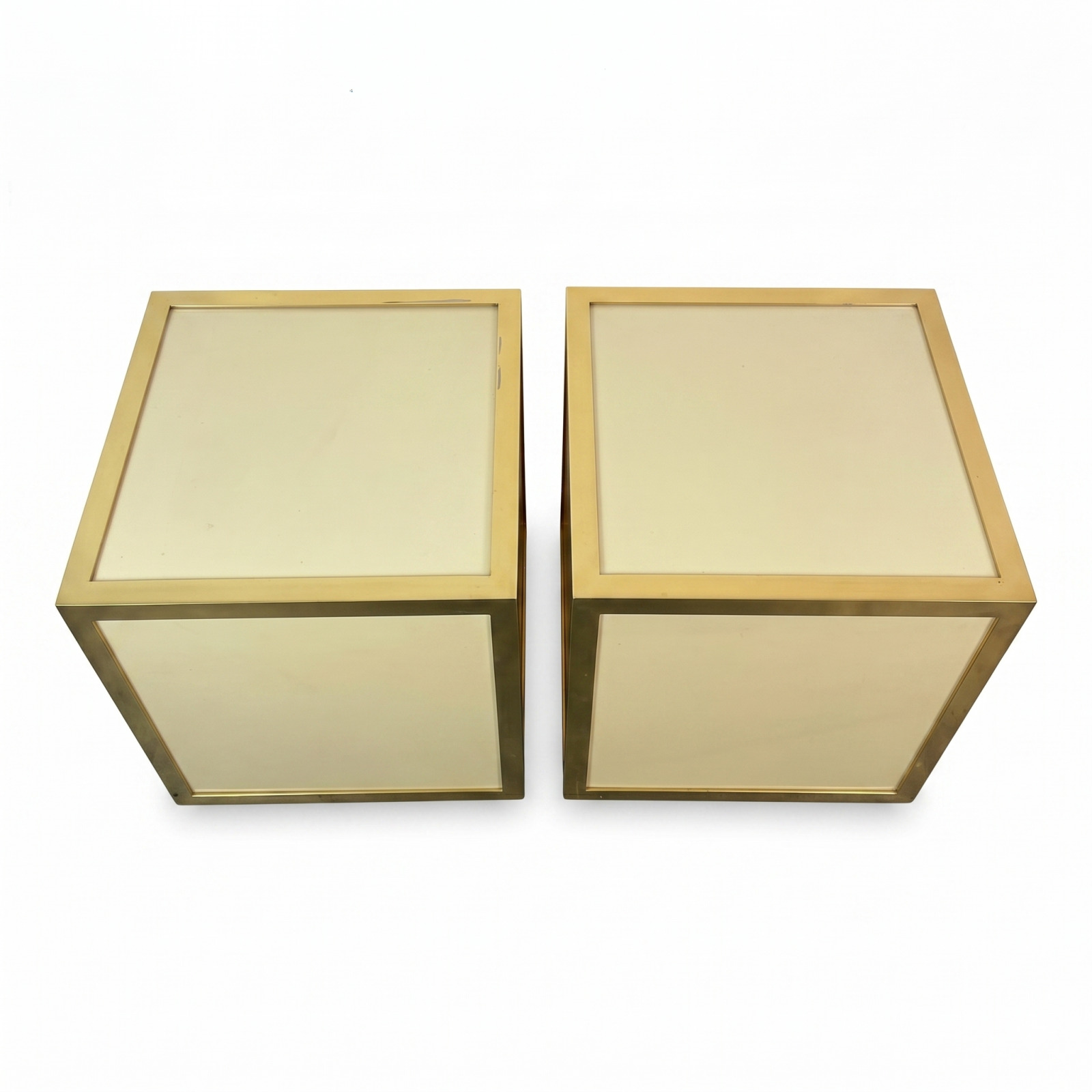 Paire de chevets design, à structure cubique, en matériau composite à panneaux crème encadrés de métal doré, 40 x 40 x 40 cm.