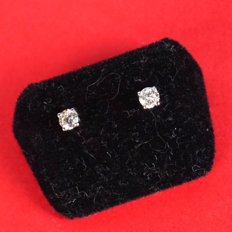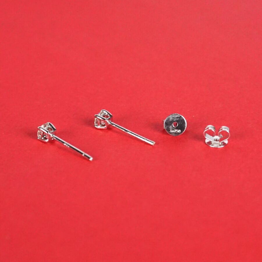 Paire de clous d'oreilles en or gris 18K (750/oo), ornés de 2 diamants taille moderne calibrant ensemble 0.28 ct environ en serti 4 griffes, fermoirs poussettes belges. Dim : 3.3 x 3.3 mm. Poids brut : 0.7 g environ.