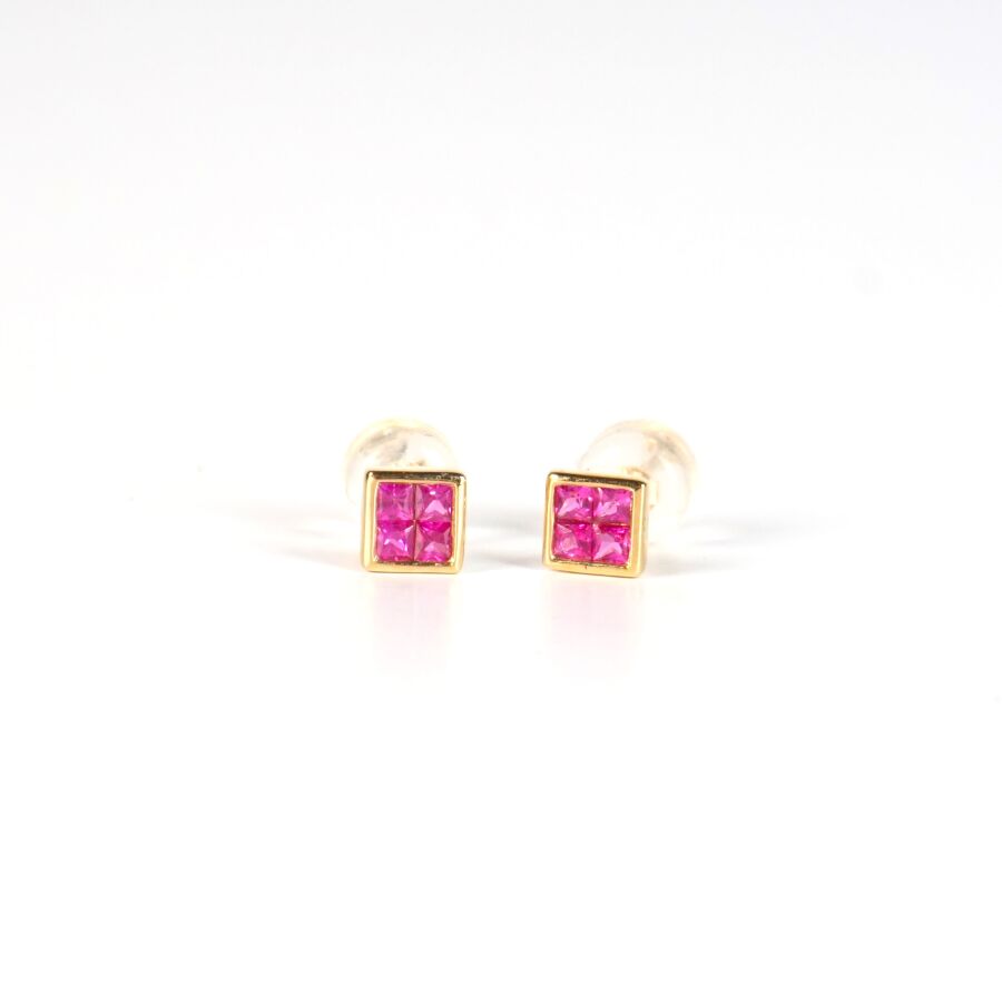 Paire de clous d'oreilles en or jaune 18K (750/oo), la tête à motif d'un carré serti chacun de 4 rubis calibrant au total 0.30 ct environ, fermoirs poussette belges sous silicone, Dim : 4.5 x 4.5 mm. Poids brut : 0.8 g environ.