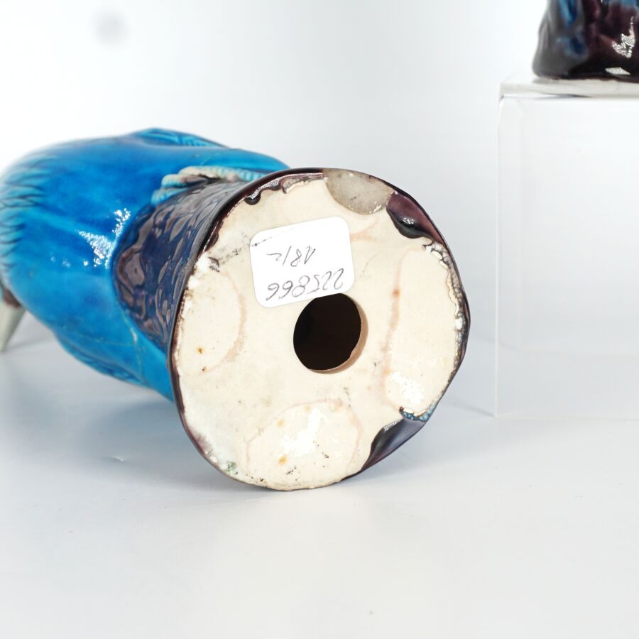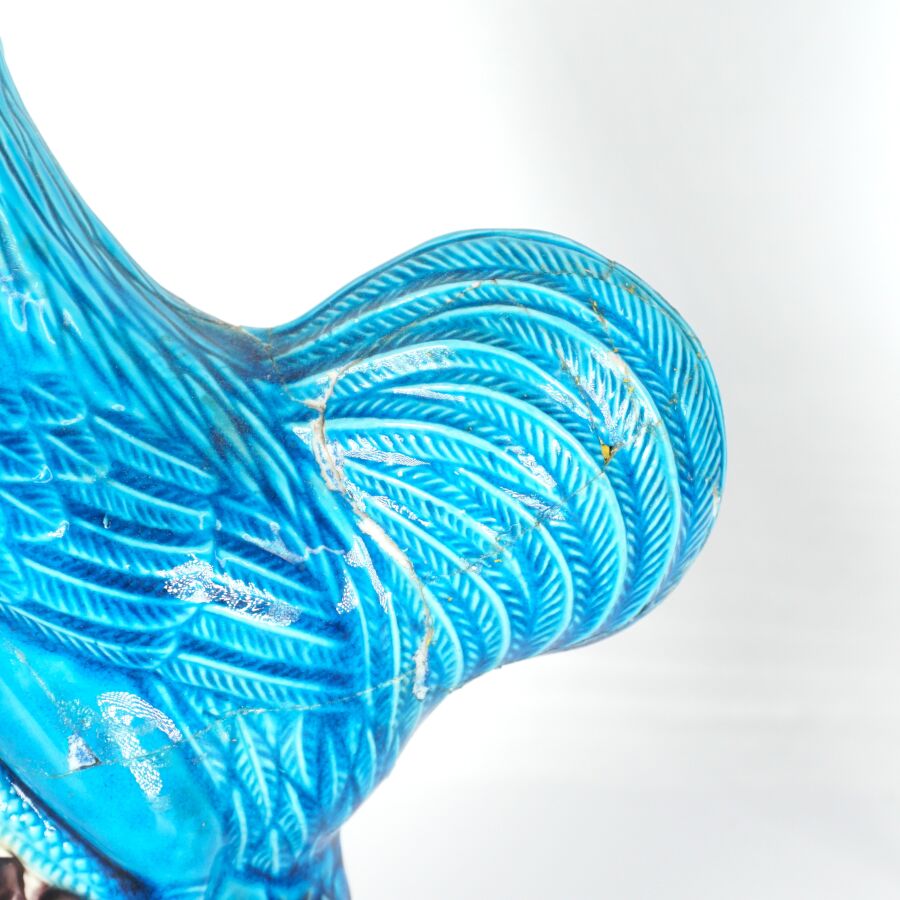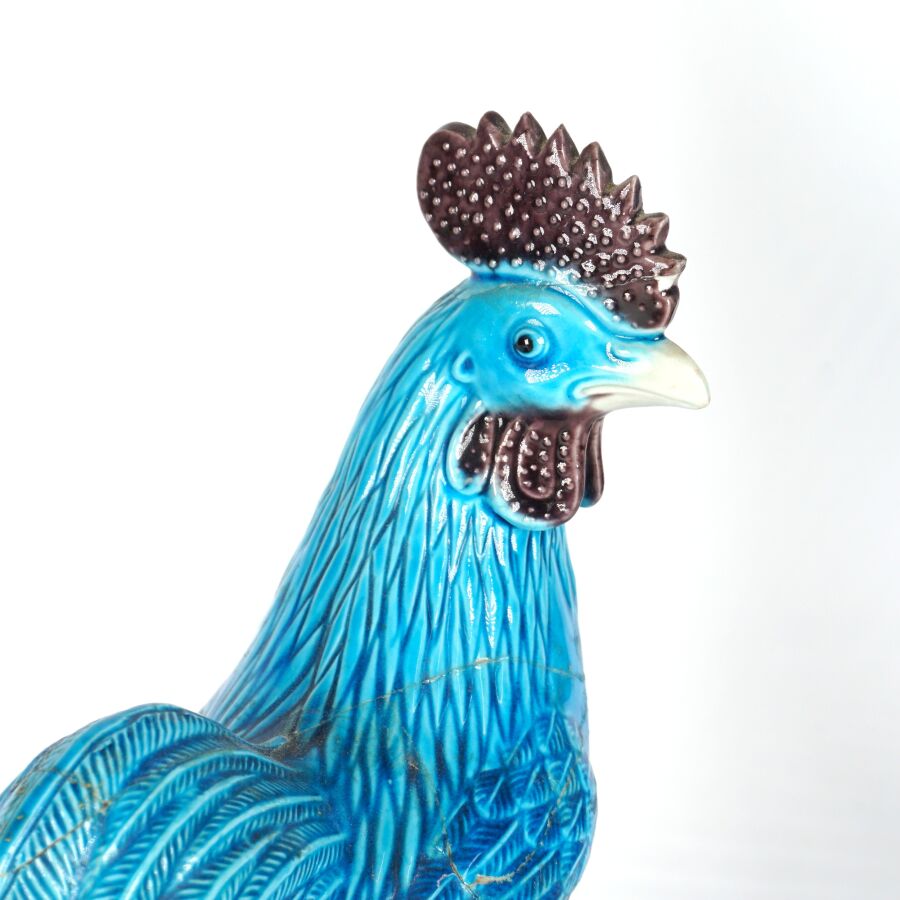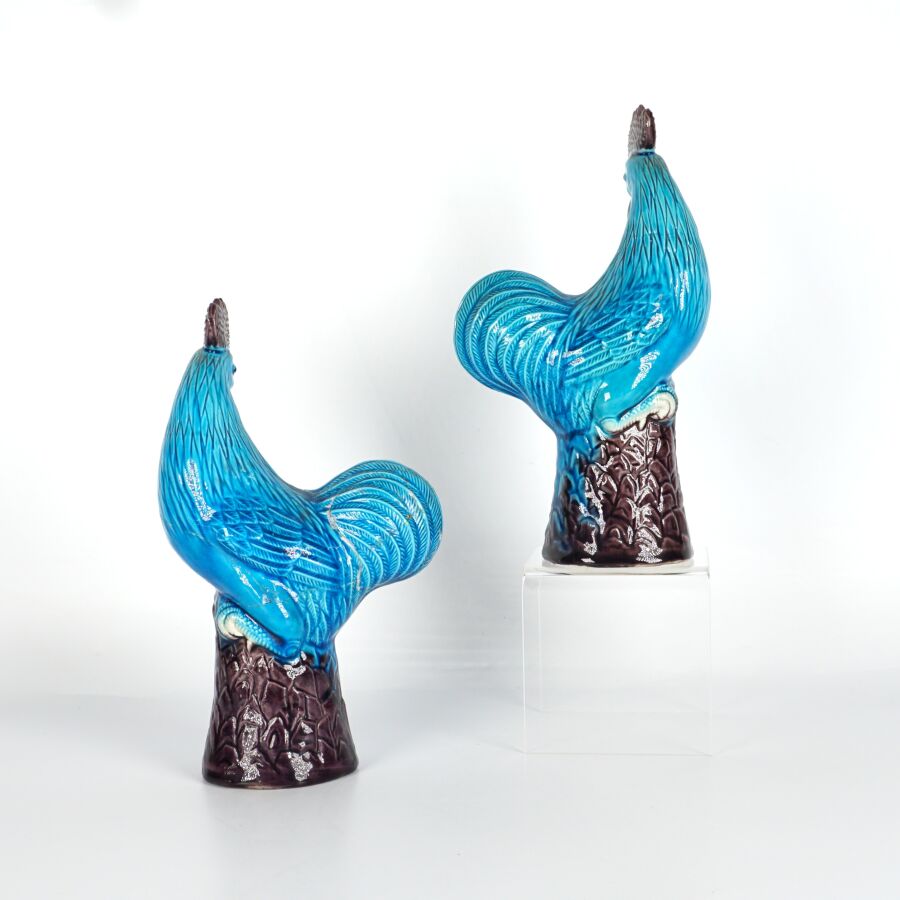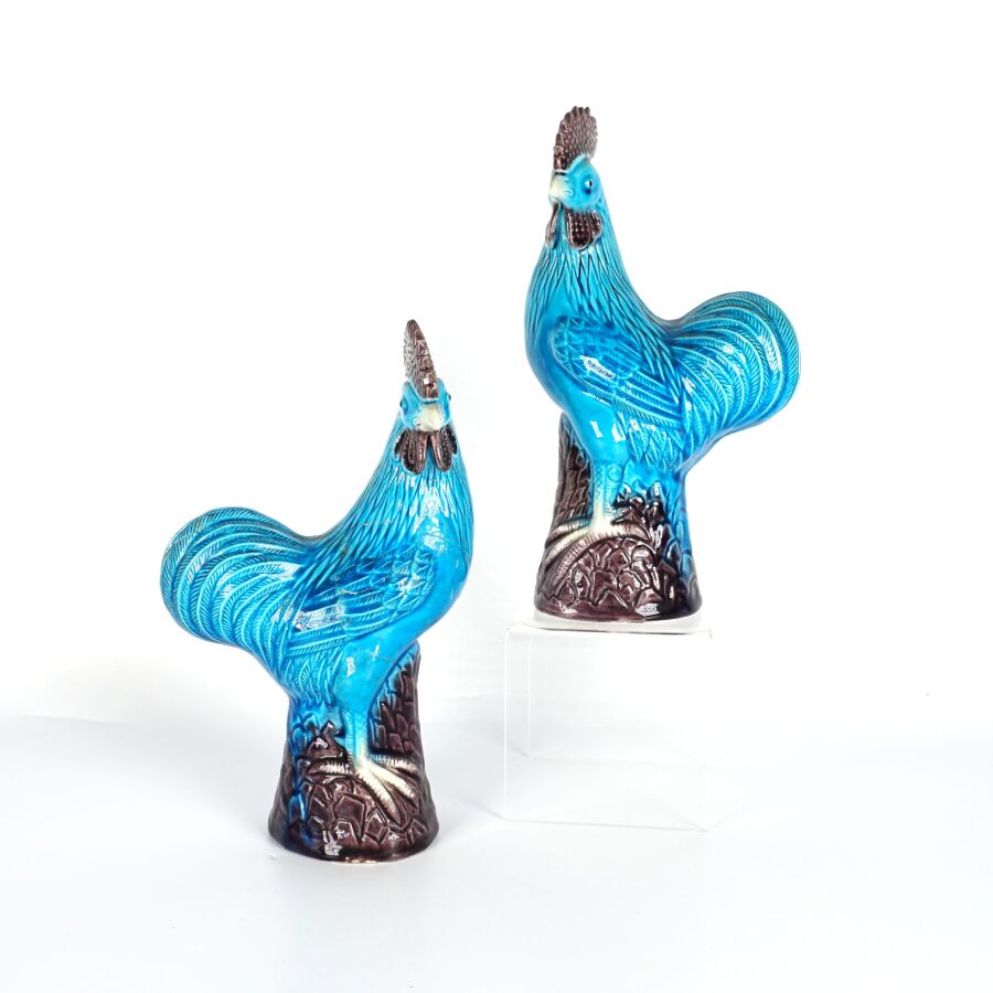 Paire de coqs en porcelaine émaillée, dans le goût de la Chine, H. 20 cm (importantes restaurations à l'un).