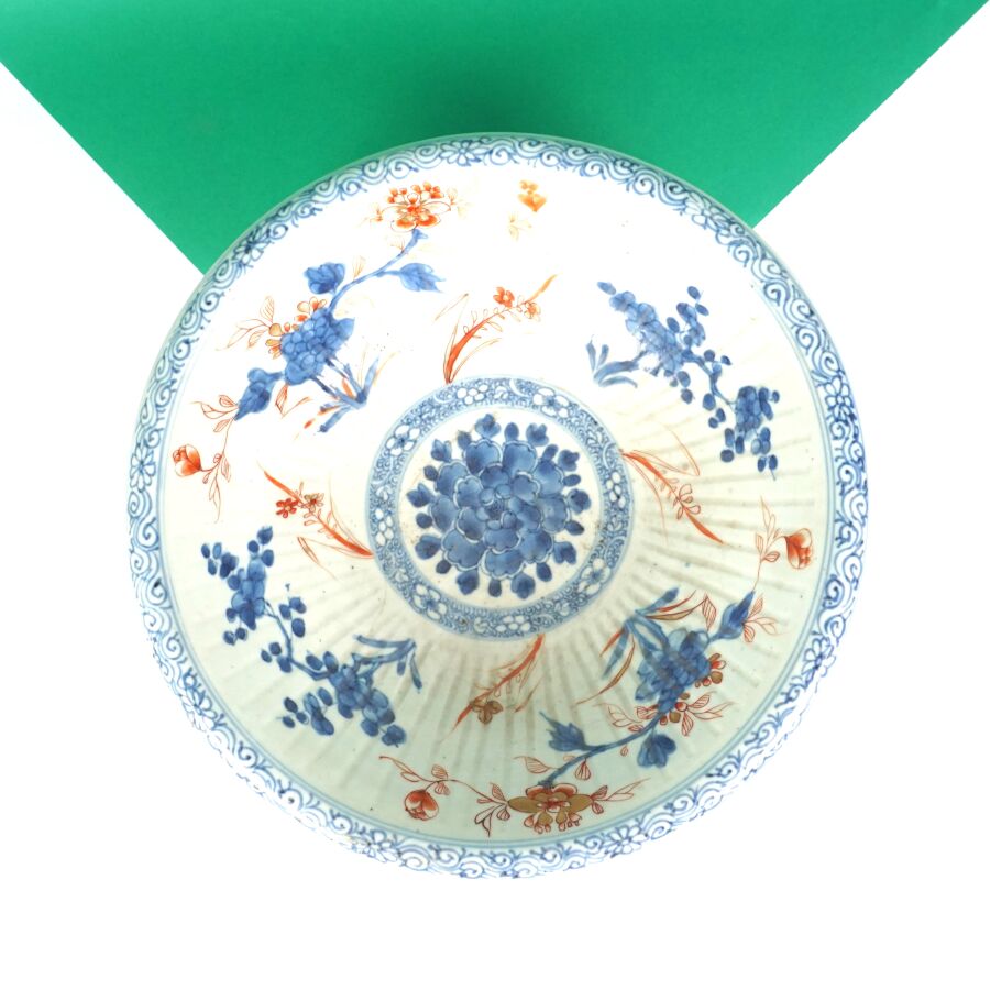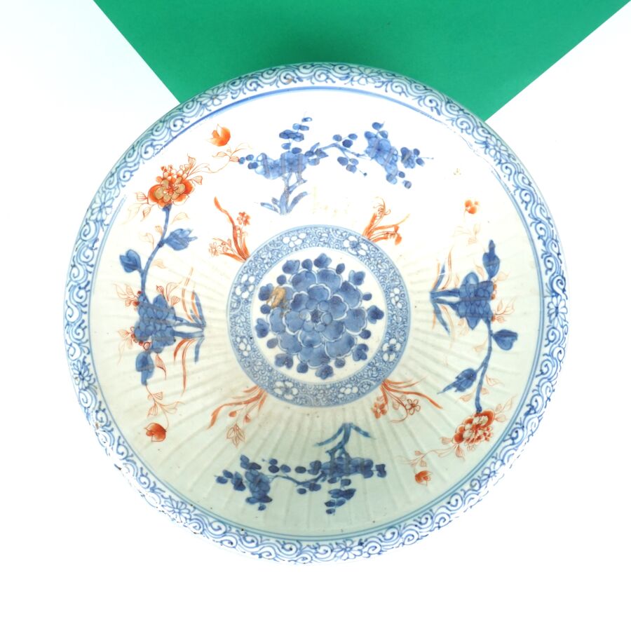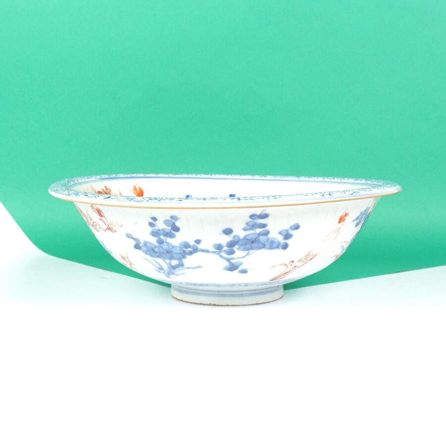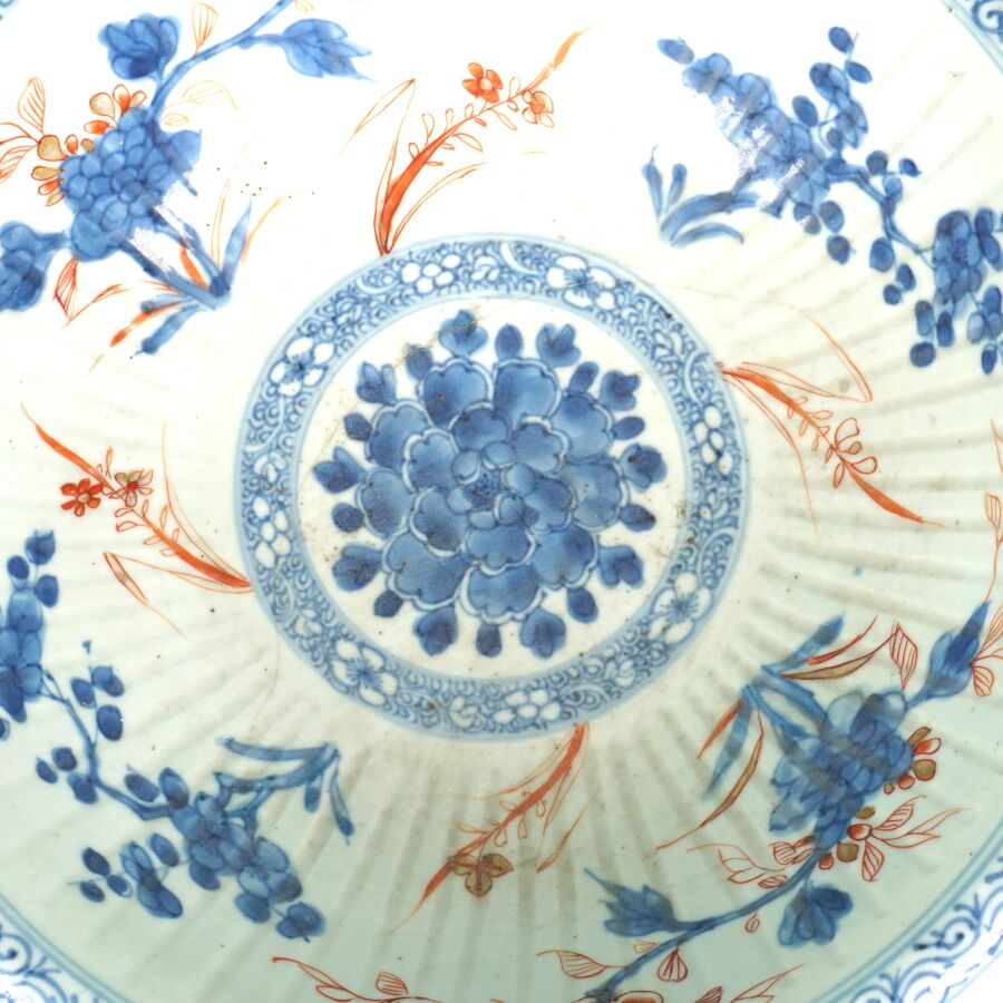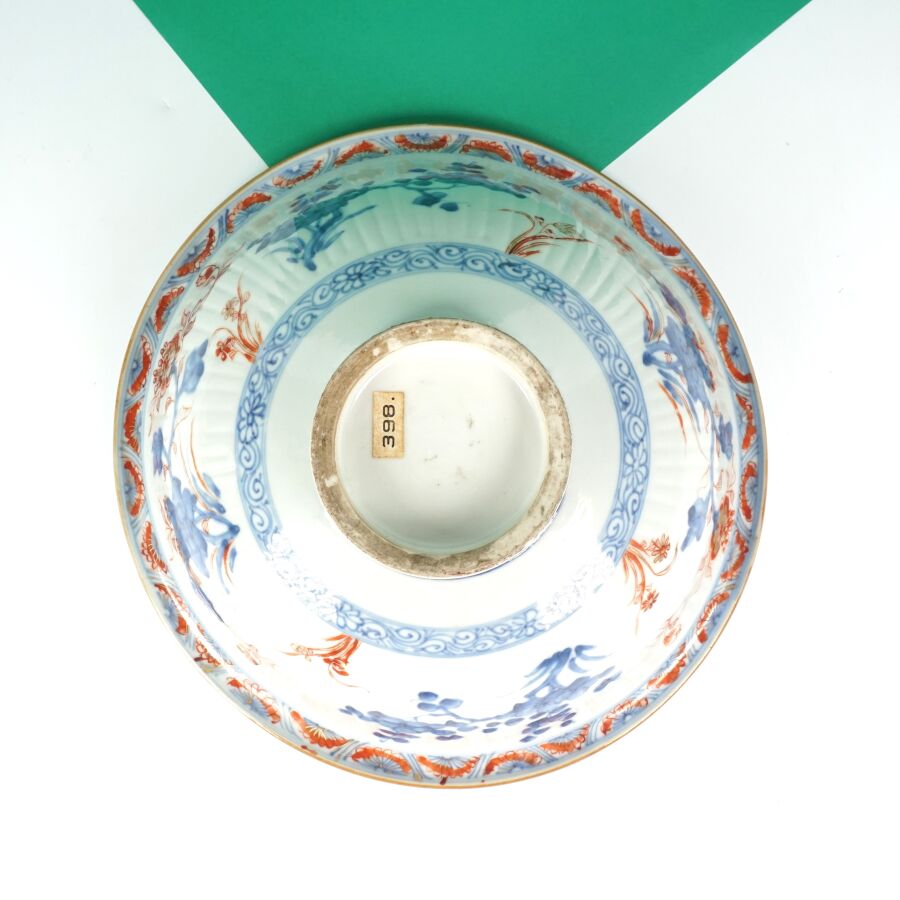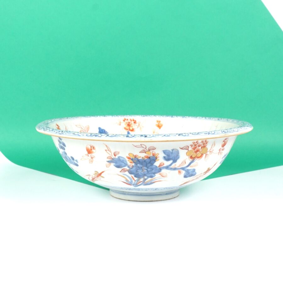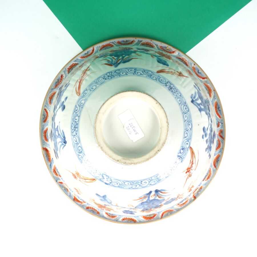 Paire de coupes en porcelaine émaillée à décor dit "Imari chinois", ornées de fleurs de pivoines, de prunus et de magnolias, Chine, Compagnie des Indes, 18ème siècle, D. 26 cm. H. 9 cm (fêle sur l'une des coupes).