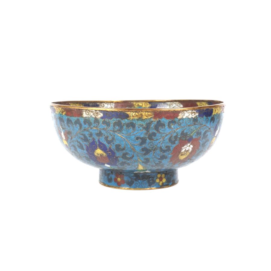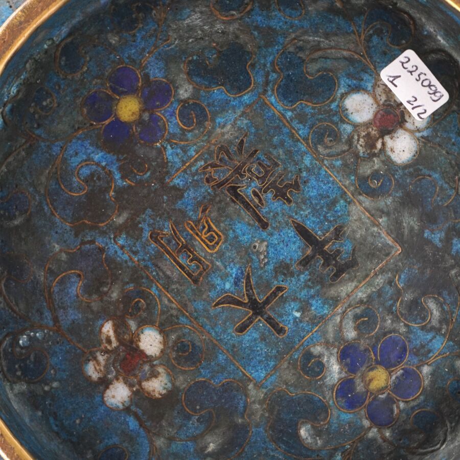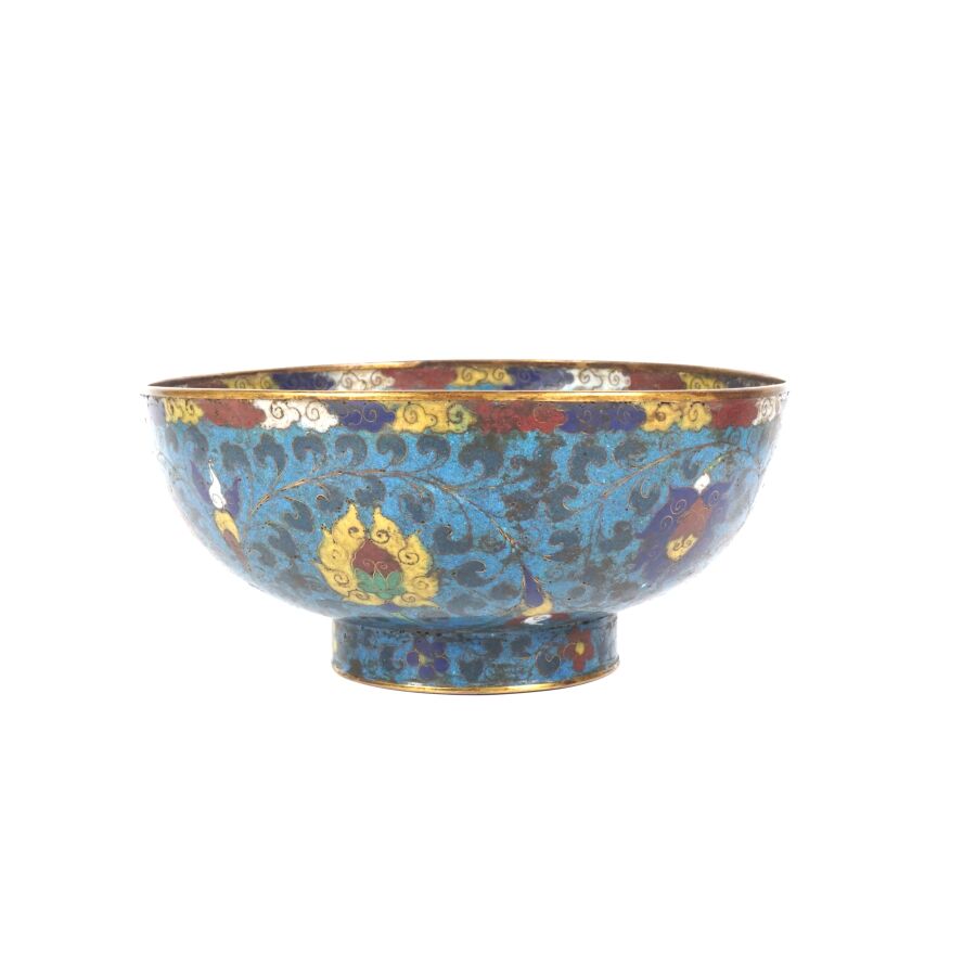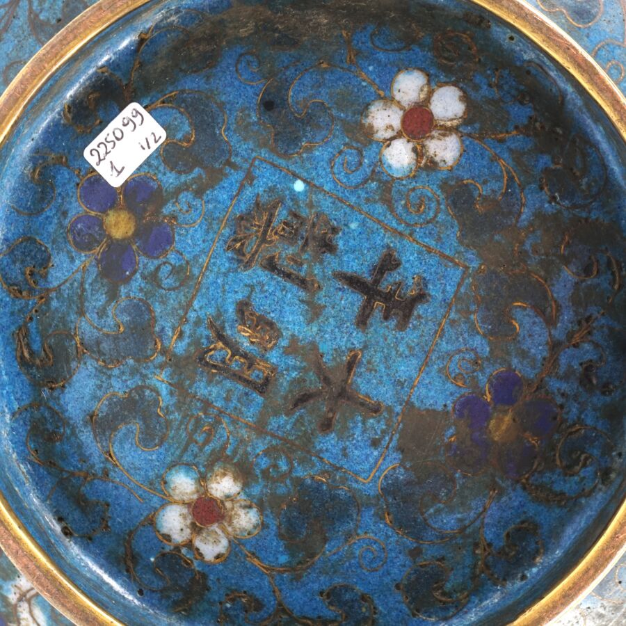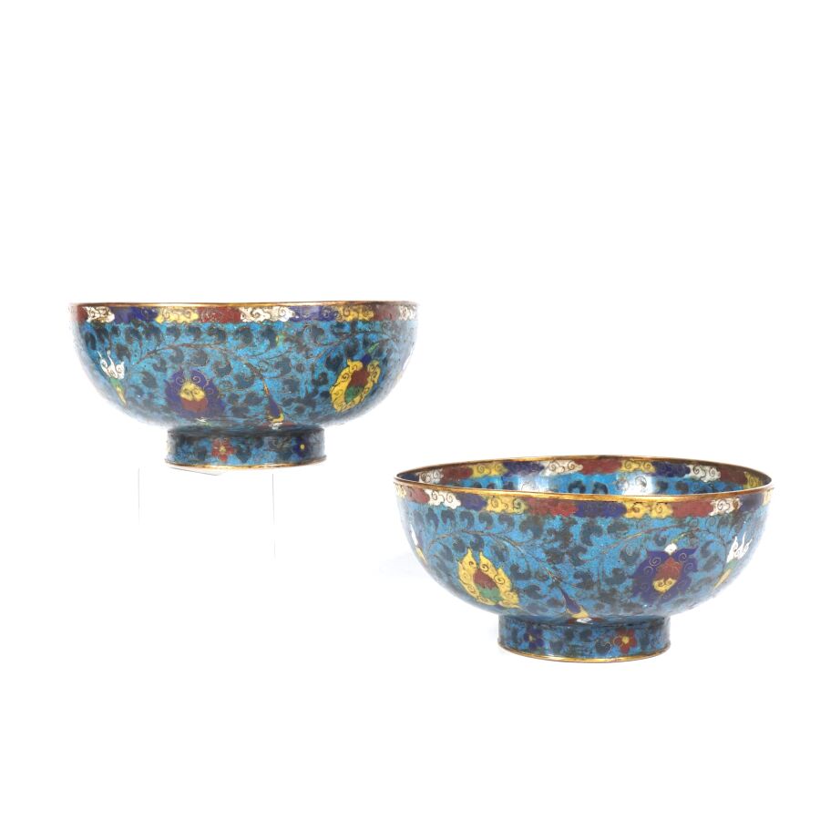 Paire de coupes sur petit talon en émaux cloisonnés sur cuivre à décor polychrome de lotus et de tiges feuillagées, style Ming, marque apocryphe Jintai dessous, Chine, fin de l'époque Qing, H. 11 cm. Diam. 25,2 cm.