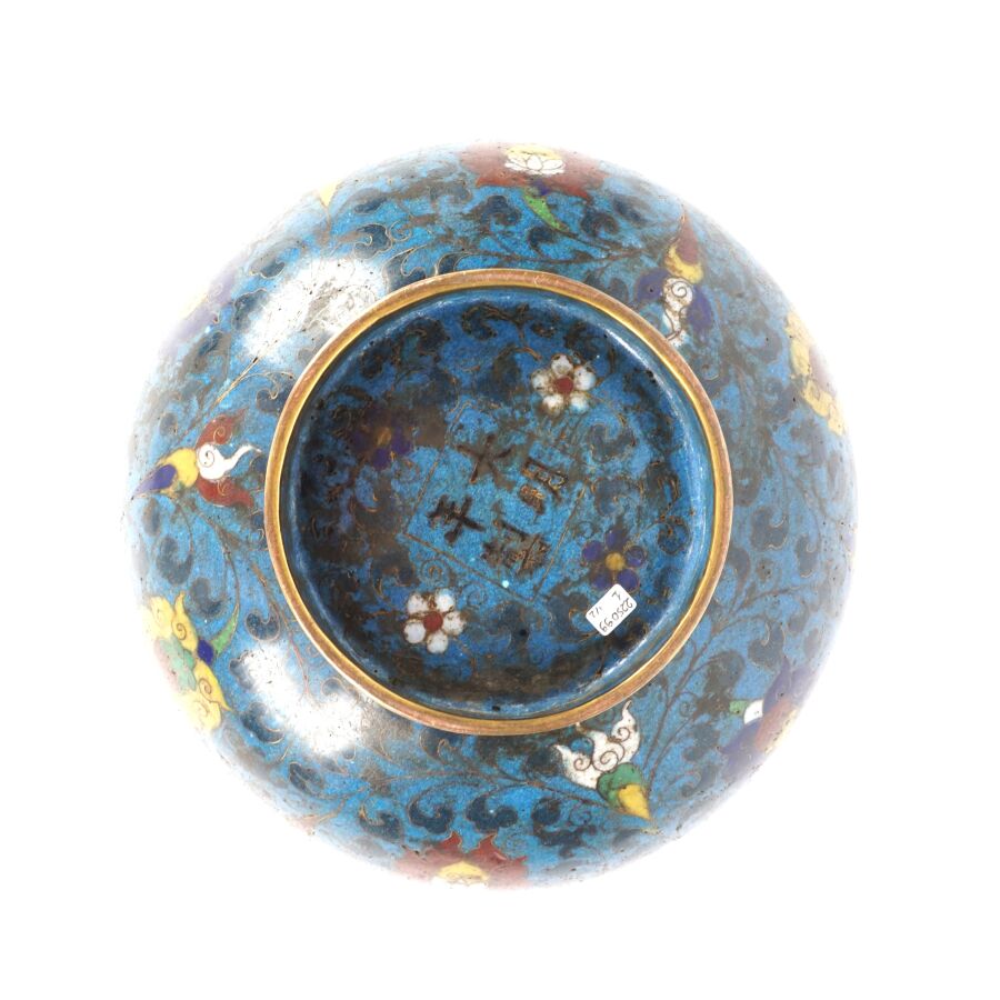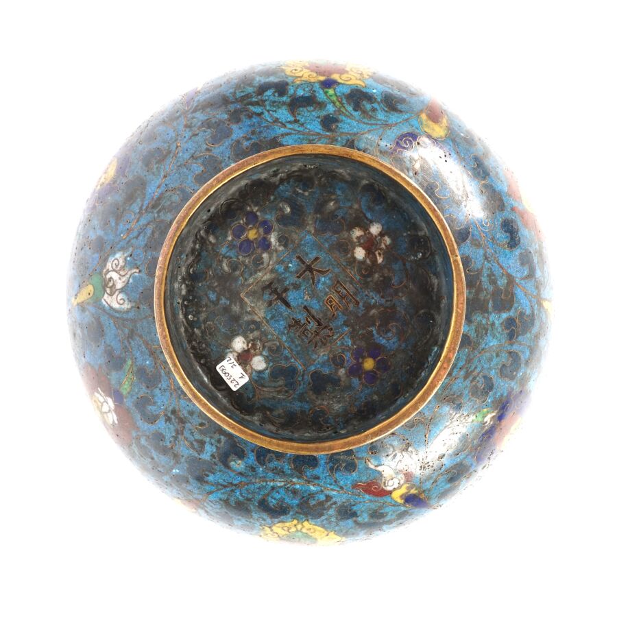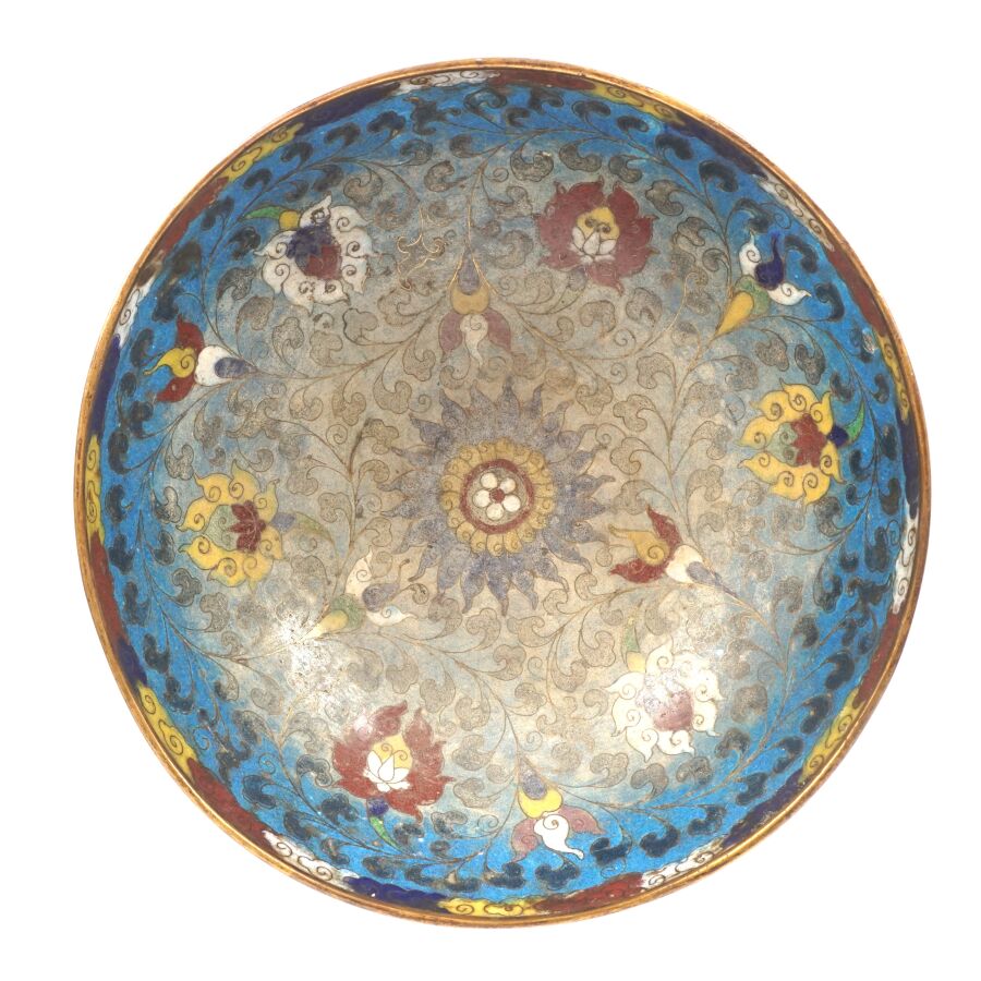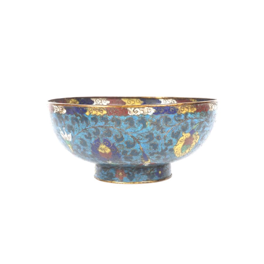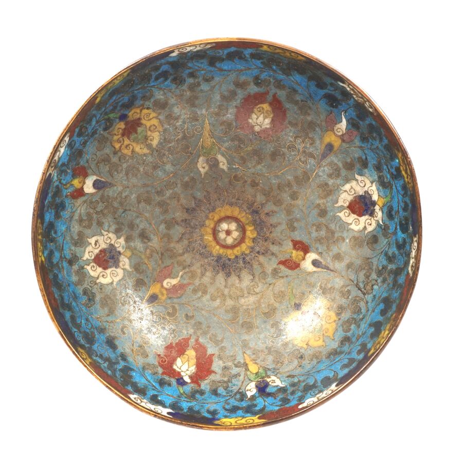 Paire de coupes sur petit talon en émaux cloisonnés sur cuivre à décor polychrome de lotus et de tiges feuillagées, style Ming, marque apocryphe Jintai dessous, Chine, fin de l'époque Qing, H. 11 cm. Diam. 25,2 cm.
