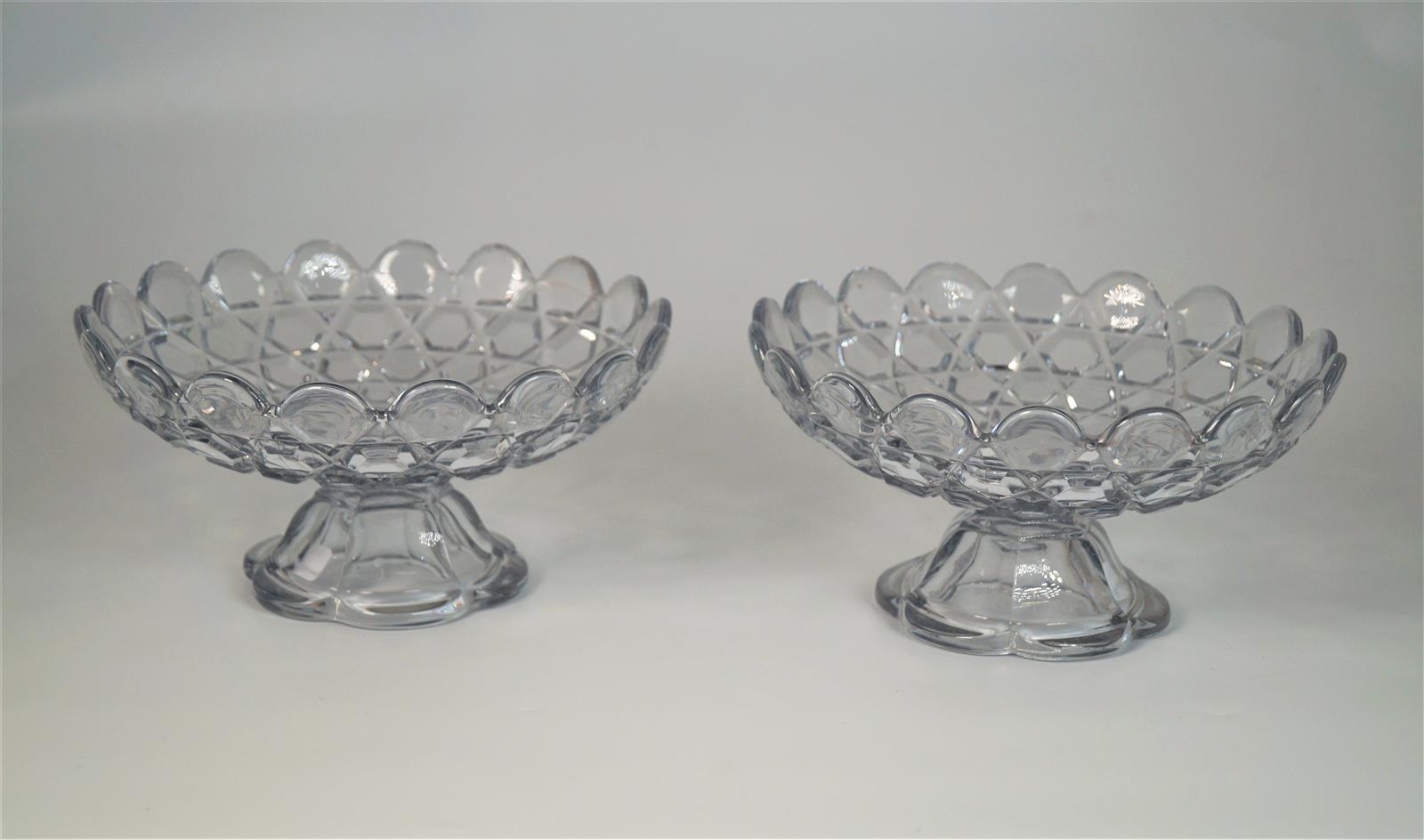 Paire de coupes sur piédouche en cristal moulé à décor géométrique d'hexagones, bord festonné, D. 20.5 cm, H. 10.5 cm (quelques rayures d'usage).