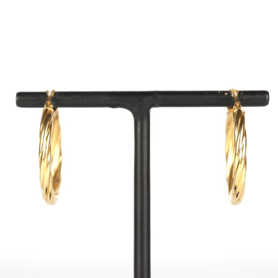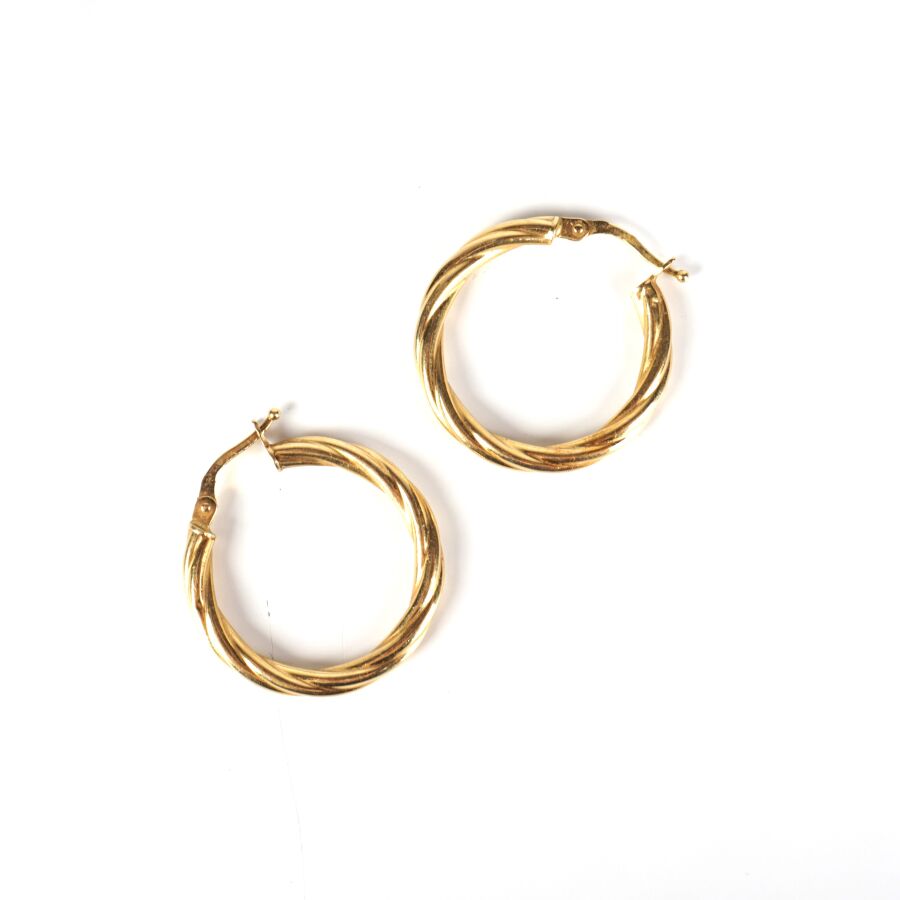 Paire de créoles en or jaune 18K (750/oo), anneau torsadé, fermoirs catalans, Diam. 2.6 cm. Larg. 3 mm. Poids brut : 2.2 g environ.