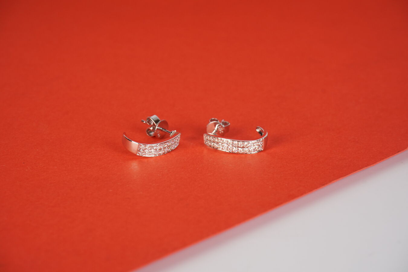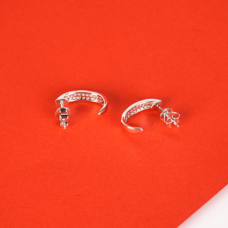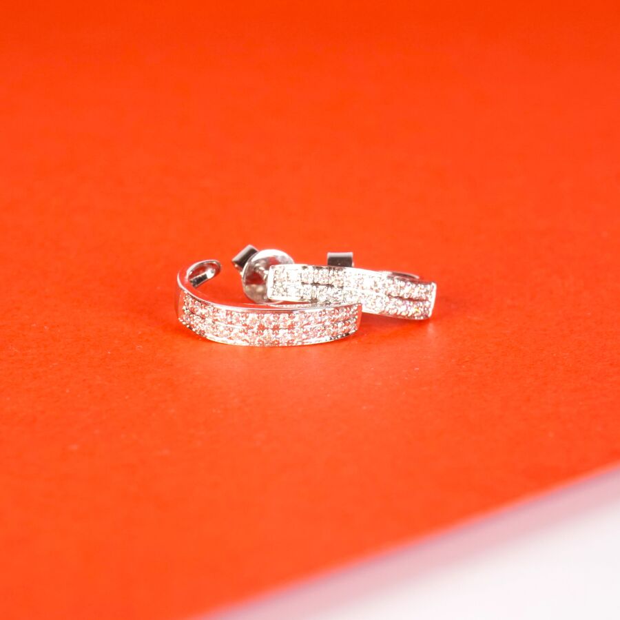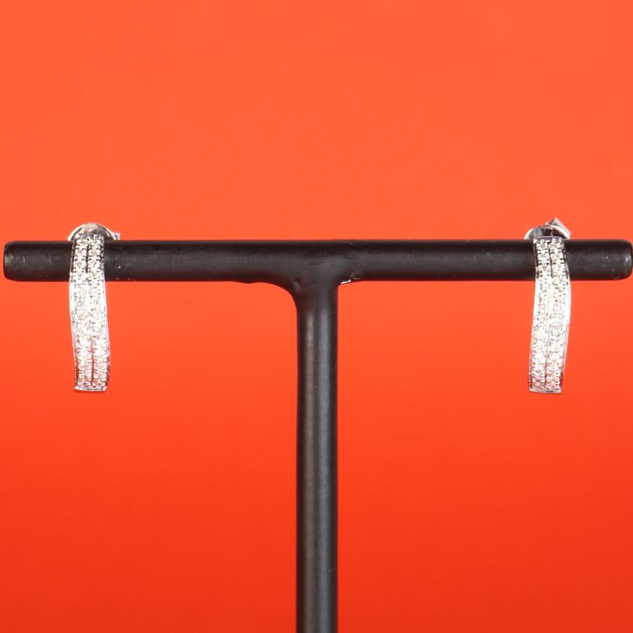 Paire de demi créoles "Double Ligne" en or gris 18K (750/oo), serties de 52 diamants blancs taille moderne calibrant ensemble 0.32 ct environ, fermoirs poussettes belges, Dim. 15 x 4 mm. Poids brut : 2.2 g environ.