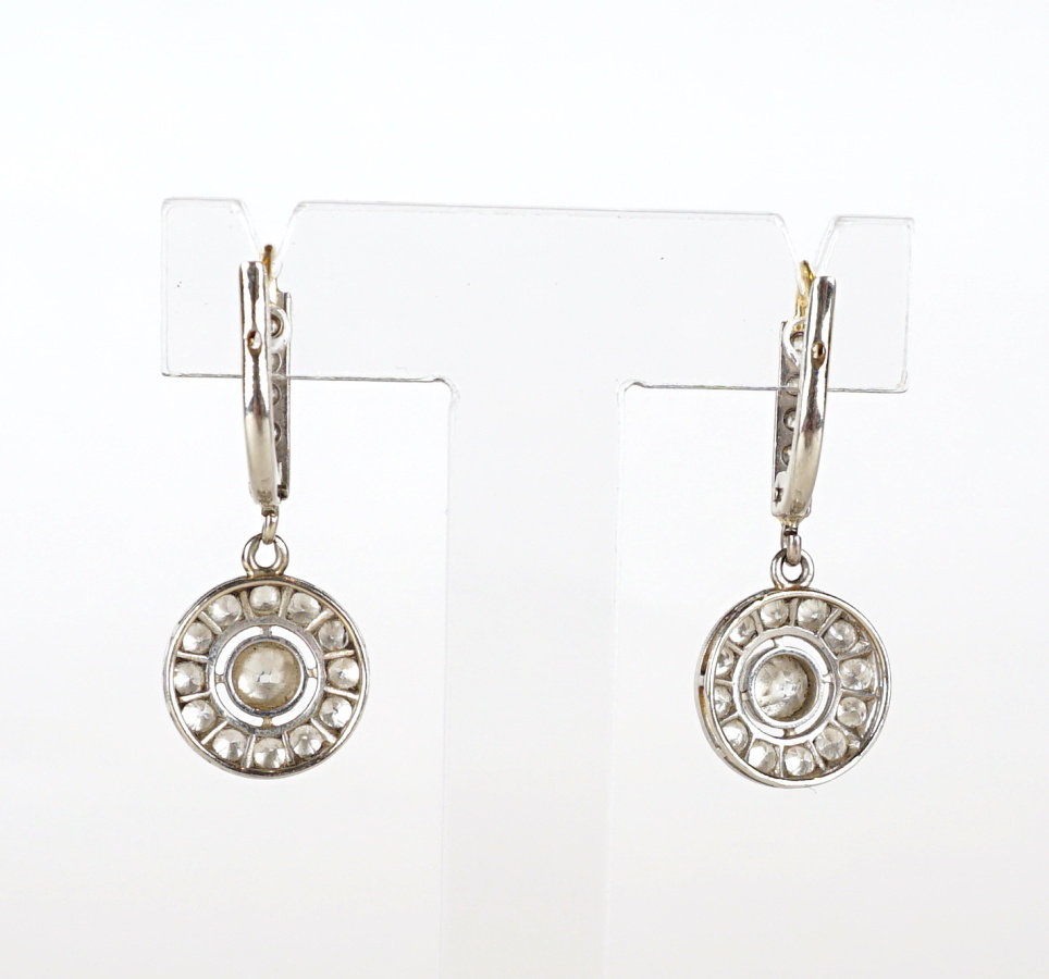 Paire de dormeuses anciennes en platine (950/oo) et en or de 2 tons 18 K (750/oo), formées d'une barrette agrémentée d'éclats de diamants, retenant un motif rond ajouré et mobile orné au centre d'un diamant taille ancienne, 0.2 ct environ (l'un accidenté), dans un entourage de petits diamants, H. 3 cm, D. 3.2 cm. Poids brut : 4.1 g environ.