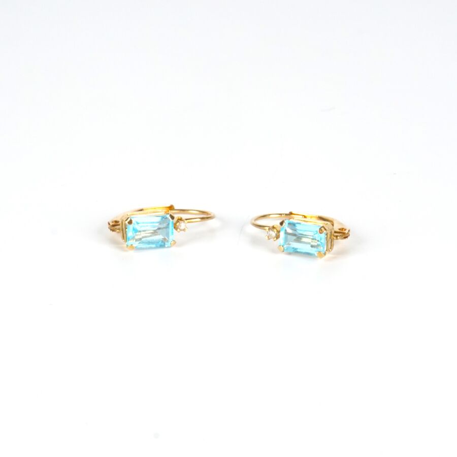 Paire de dormeuses en or 14K (585/oo), serties chacune d'une topaze de taille émeraude (D. 6 x 4 mm), surmontées chacune d'un petit diamant, H. 1.9 cm. Poids brut : 1 g environ.