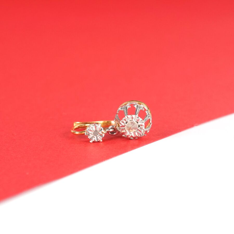 Paire de dormeuses en or deux tons 18K (750/oo), poinçon tête de cheval (1838-1919); la partie haute à motif d'une petite fleurette agrémentée au centre d'un petit brillant, la partie pendante à motif d'un dôme ajouré retenant au centre un petit diamant taille rose calibrant 0.06 ct environ, H. 1.8 cm environ. Poids brut : 2.8 g environ.