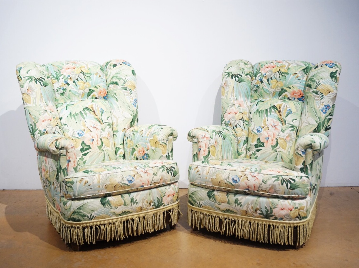 Paire de fauteuils confortables, garniture de tissu fleuri, H. 93 cm.