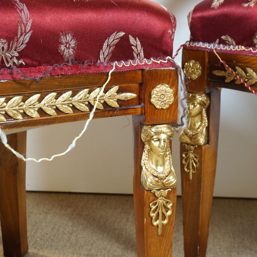 Paire de fauteuils de style retour d'Egypte, bois, à décor de bustes de femmes en chute, la ceinture ornée d'une frise de laurier, pieds avants terminant par des griffes, et dossier à enroulement, dans le goût du 19ème siècle, H. 82 cm (usures, fils tirés, éléments de la garniture à refixer).