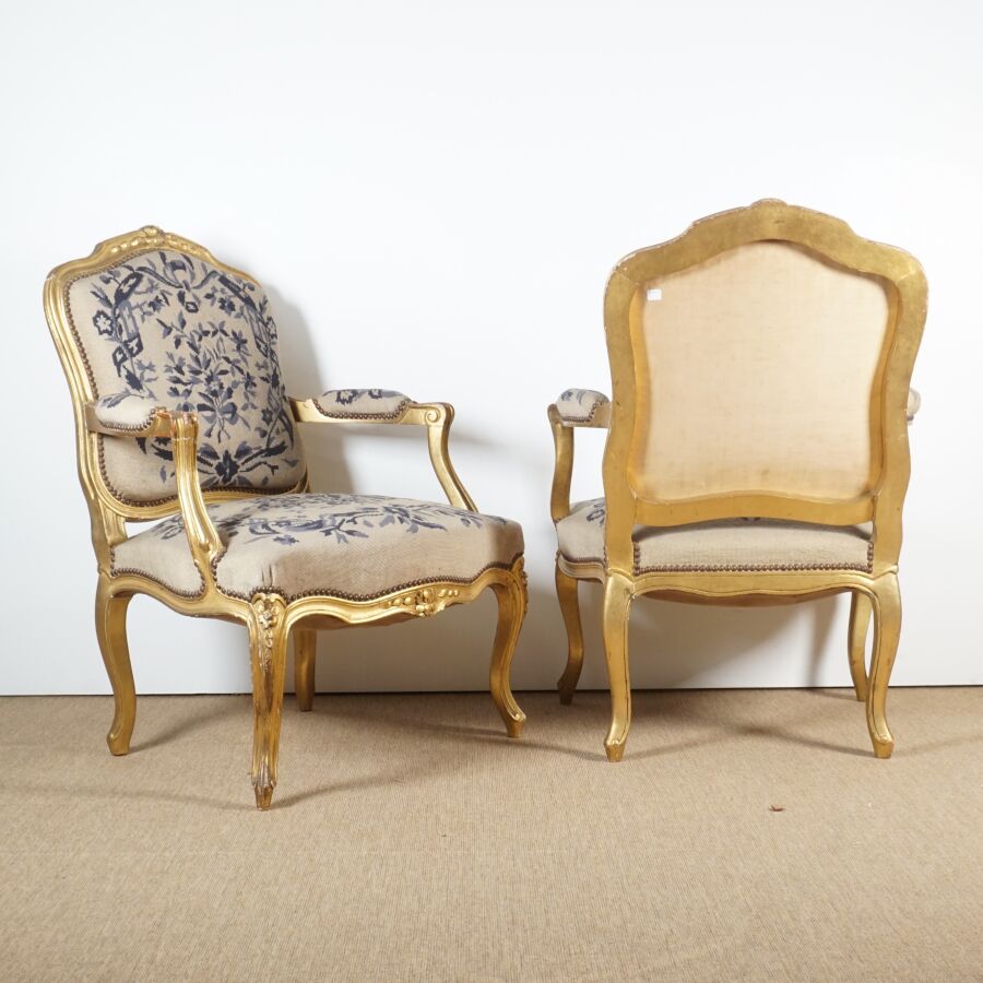 Paire de fauteuils dits "à la Reine", bois mouluré et doré à décor de fleurettes, garniture tapissée à motif bleu, travail de style Louis XV, H. 93 cm (quelques usures, sauts, et taches).
