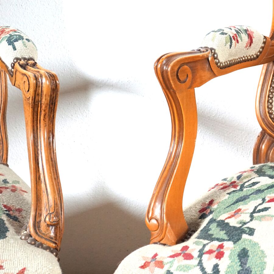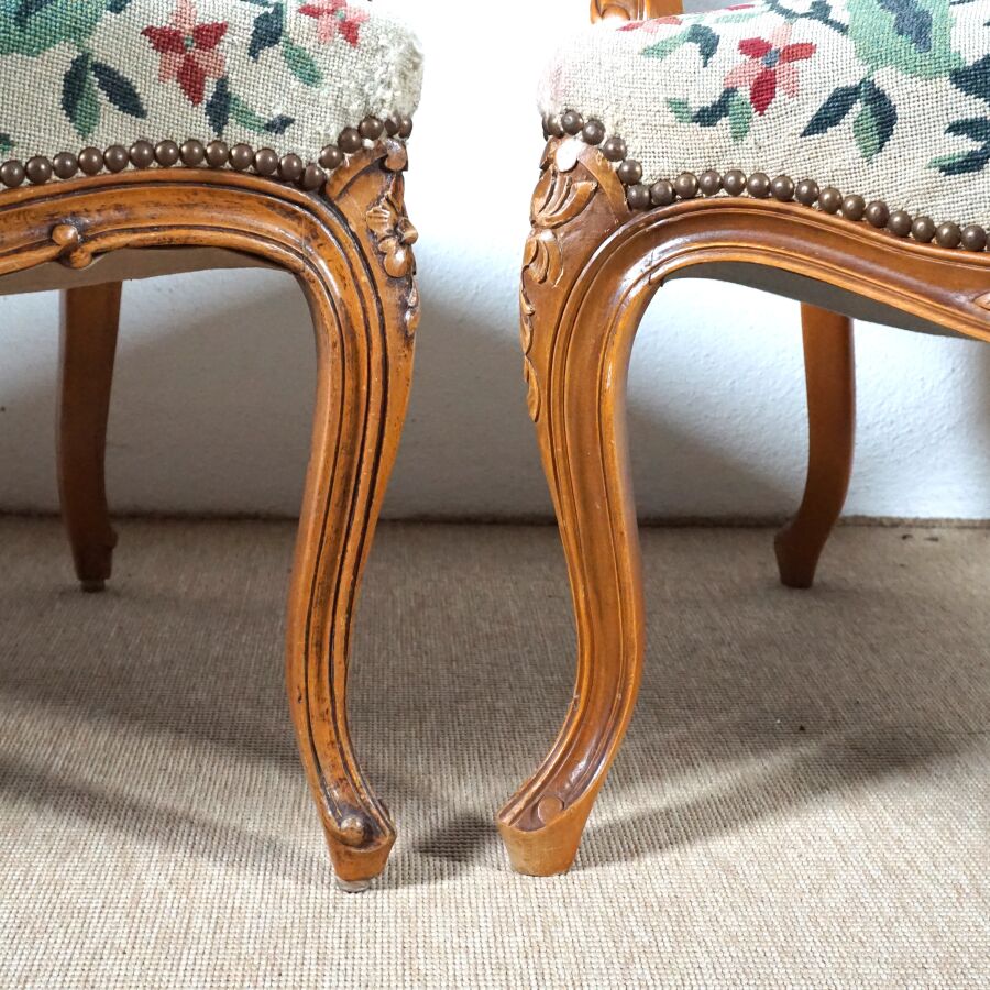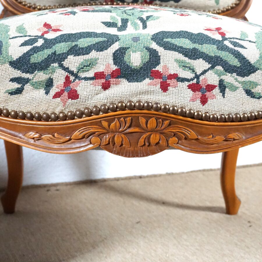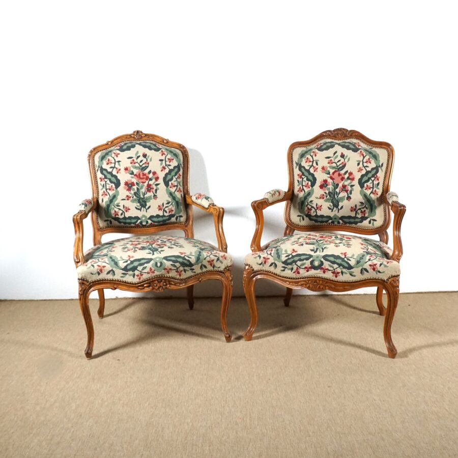 Paire de fauteuils dits "à la reine" en bois sculpté à motif de fleurettes, garniture tapissée à motif de fleurs polychromes, style 18ème siècle, H. 94 cm (petites usures d'usage).