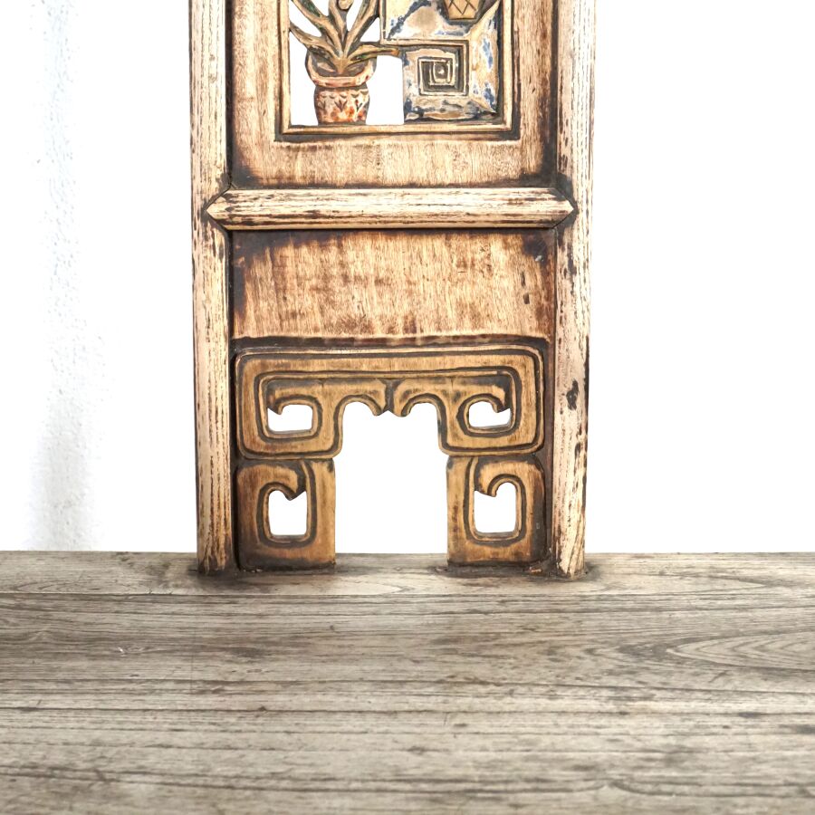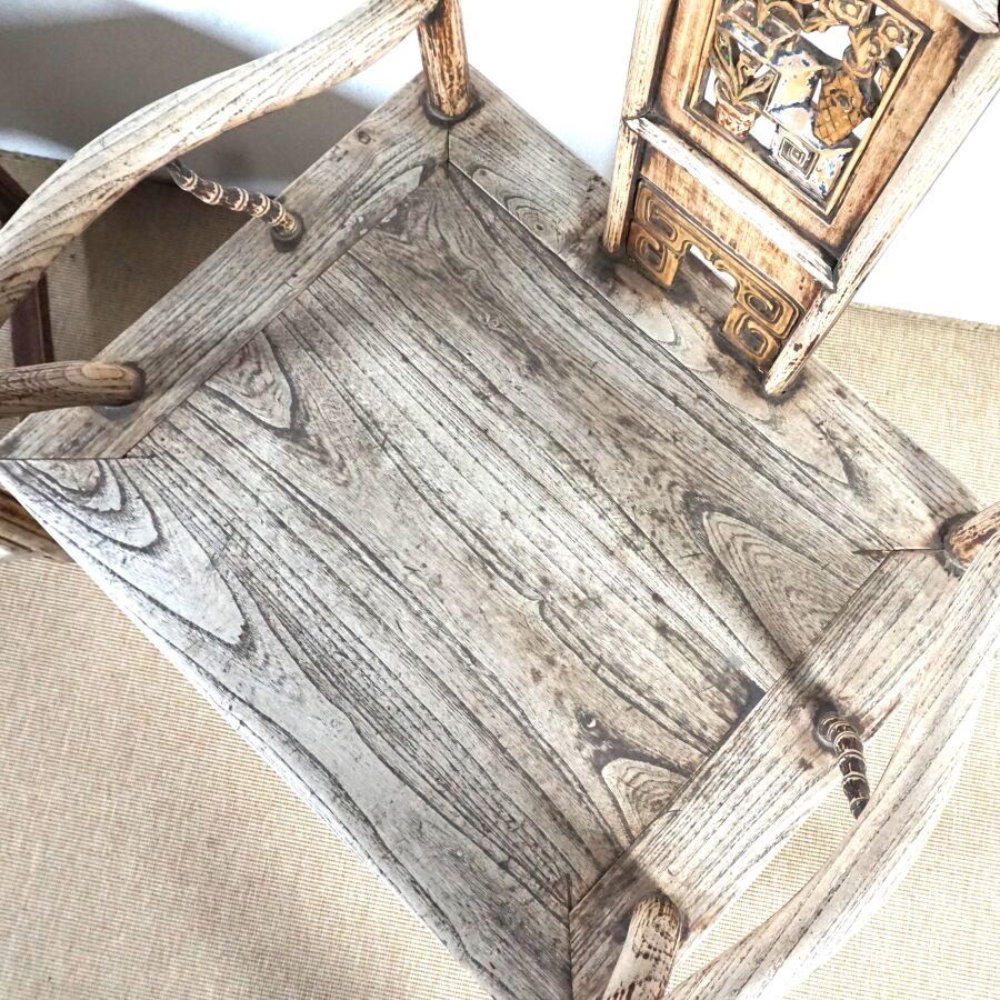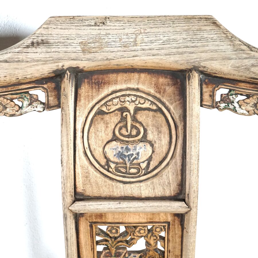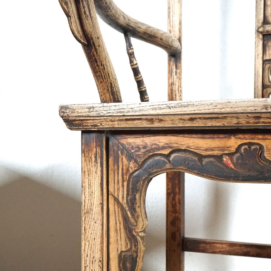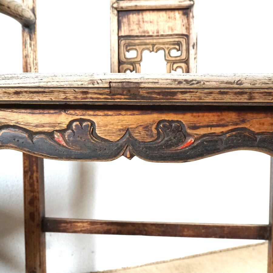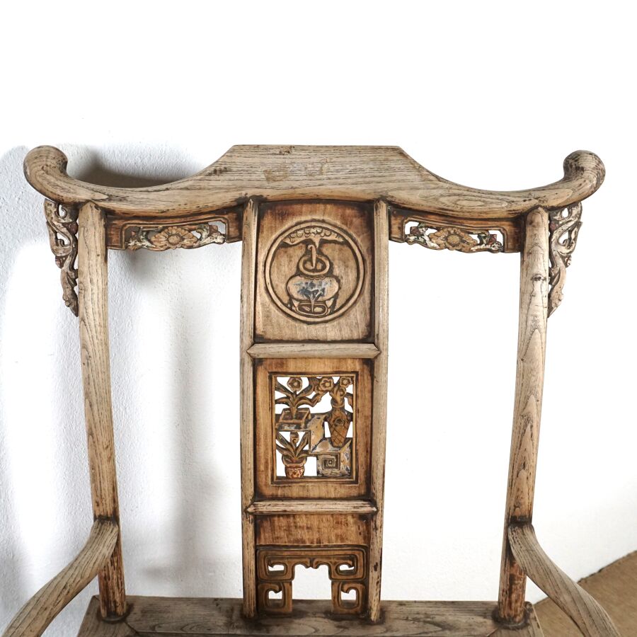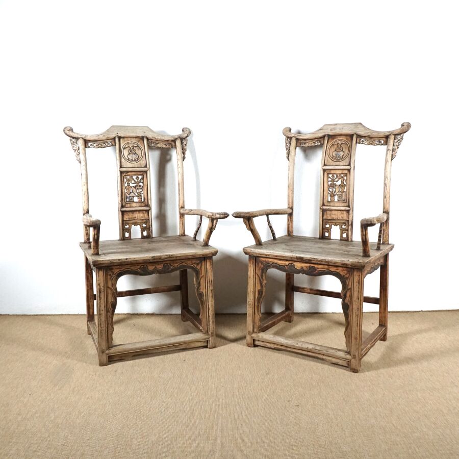 Paire de fauteuils dits "de Mandarin" en bois sculpté, dossier légèrement courbé, partie haute architecturée, bandeau vertical à décor partiellement ajouré de pots de fleurs et mobiliers, traces de polychromie, Chine, 20ème siècle, 113 x 70 x 53 cm (usures et traces).
