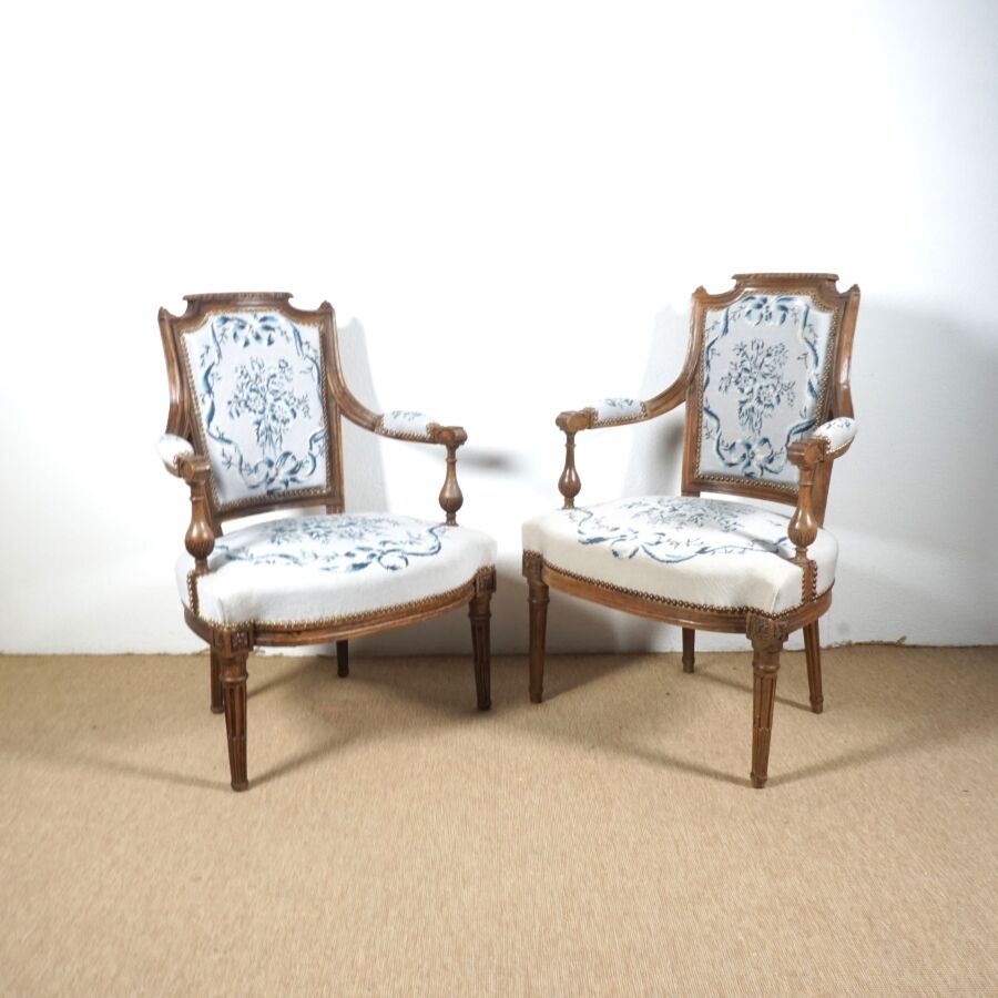 Paire de fauteuils, dossier dit "Chapeau de gendarme", bois mouluré, supports d'accotoirs de forme balustre, piétement cannelé et fuselé, garniture bleue à motif floral rapportée, Louis XVI tardif, début du 19ème siècle, H. 85.7 cm (petites usures).