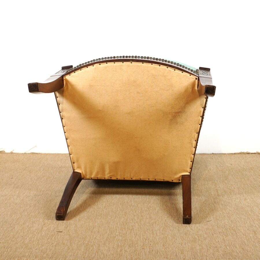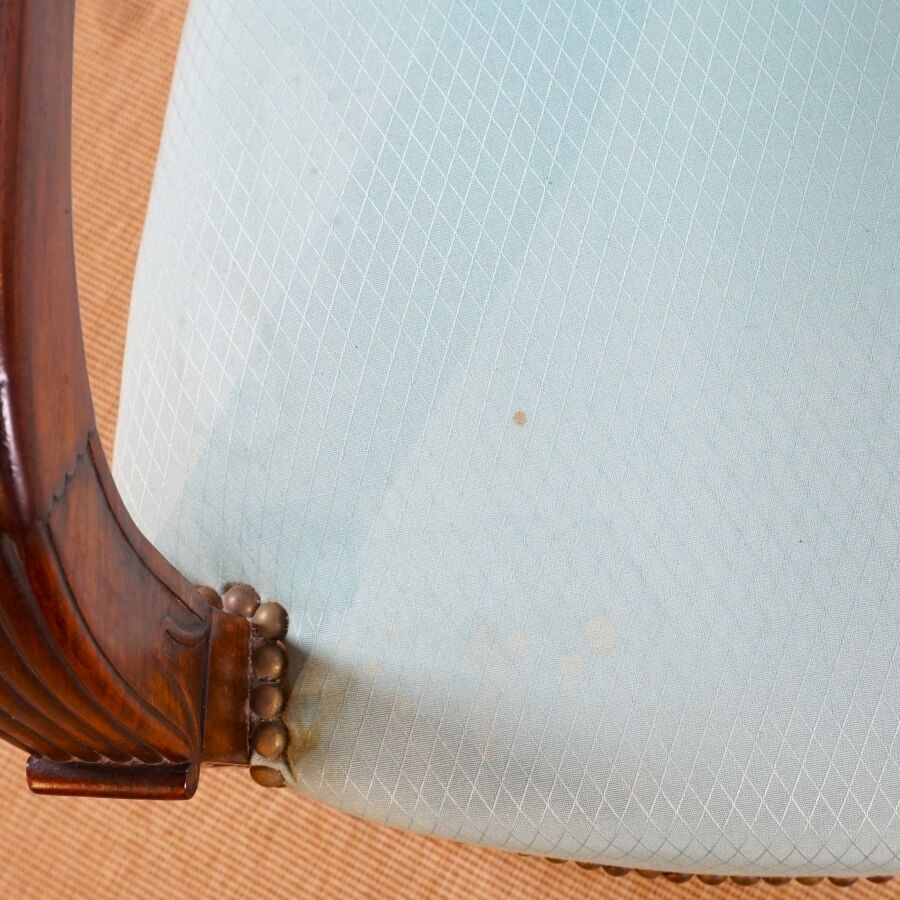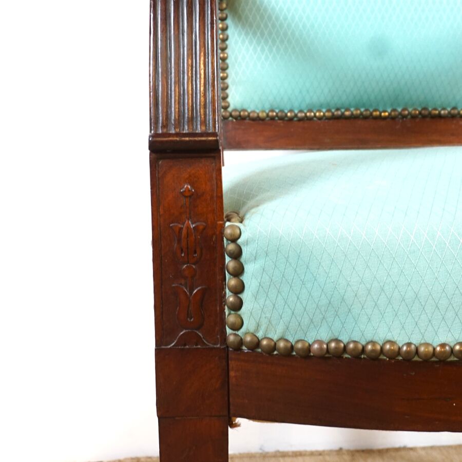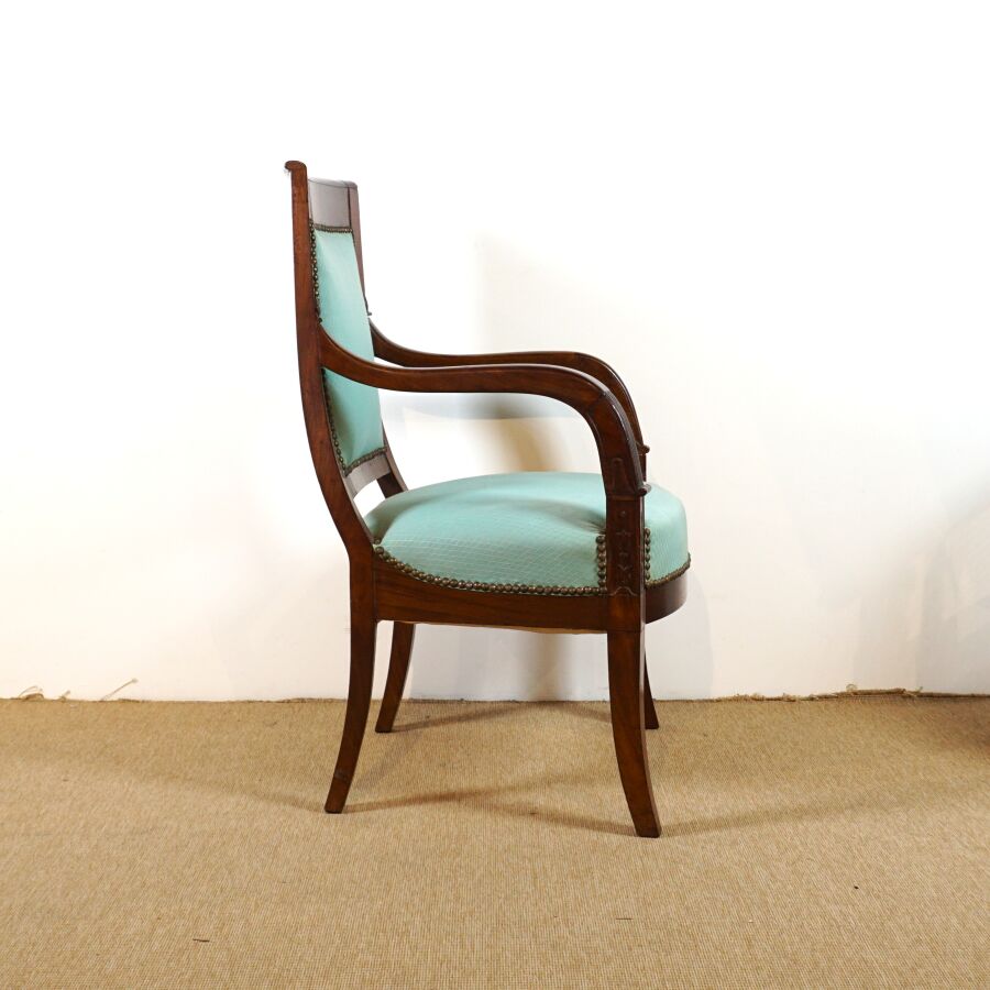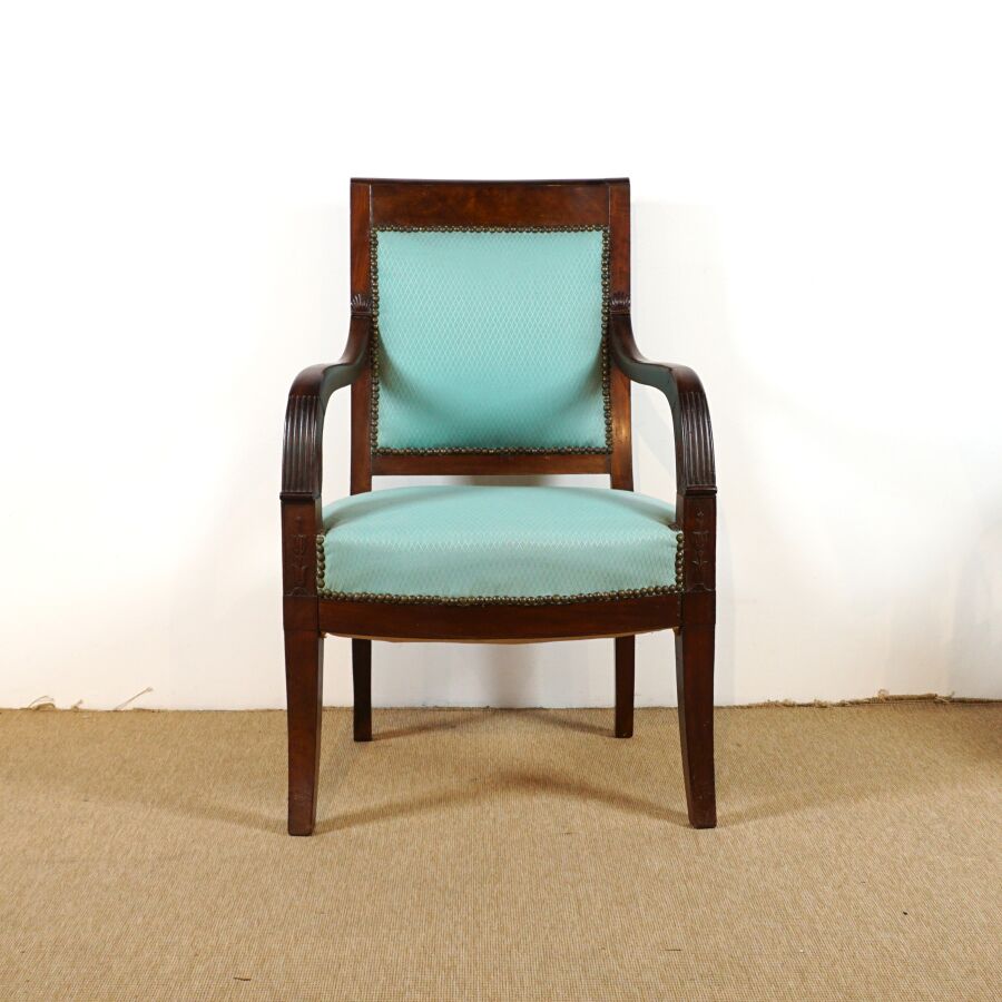 Paire de fauteuils en acajou et placage d'acajou, dossiers droits, supports d'accotoirs à motif de palmettes, piétement en léger coup de sabre, garniture en tissu turquoise, travail de style Empire, fin du 19ème siècle, H. 89 cm (tâches, rayures, vermoulu).
