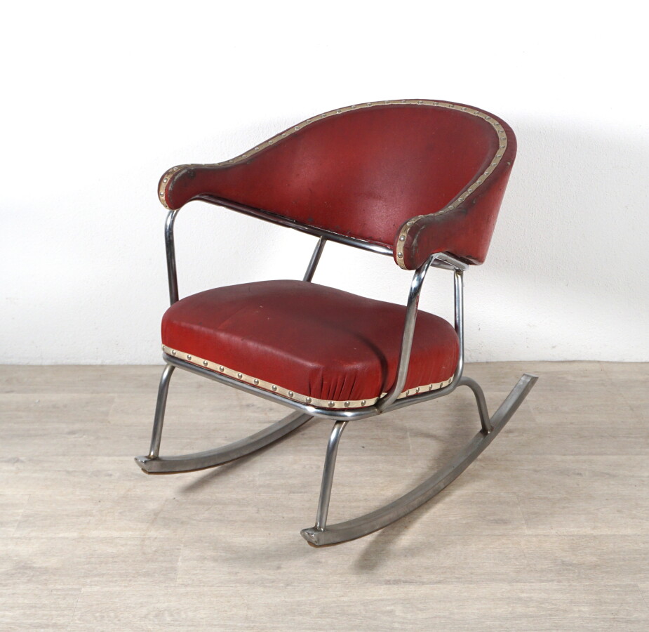 Paire de fauteuils gondoles à bascule, structure en acier tubulaire et garniture de cuir rouge, 82.5 x 62 x H .75 cm (usures du cuir, oxydations).
