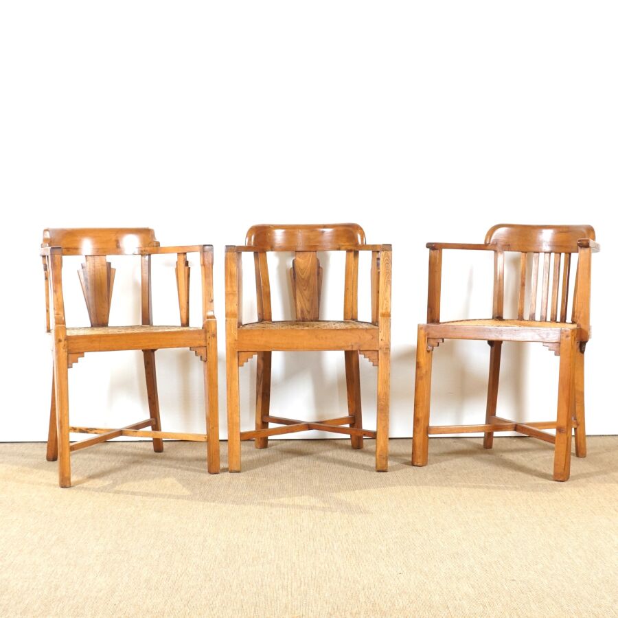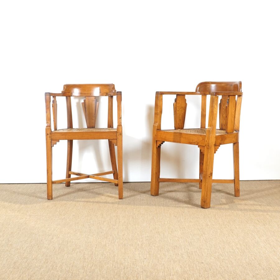 Paire de fauteuils, structure en bois, assises cannées, dossiers ajourés à bandeaux architecturés, travail de style colonial, H. 76.3 cm (usures).