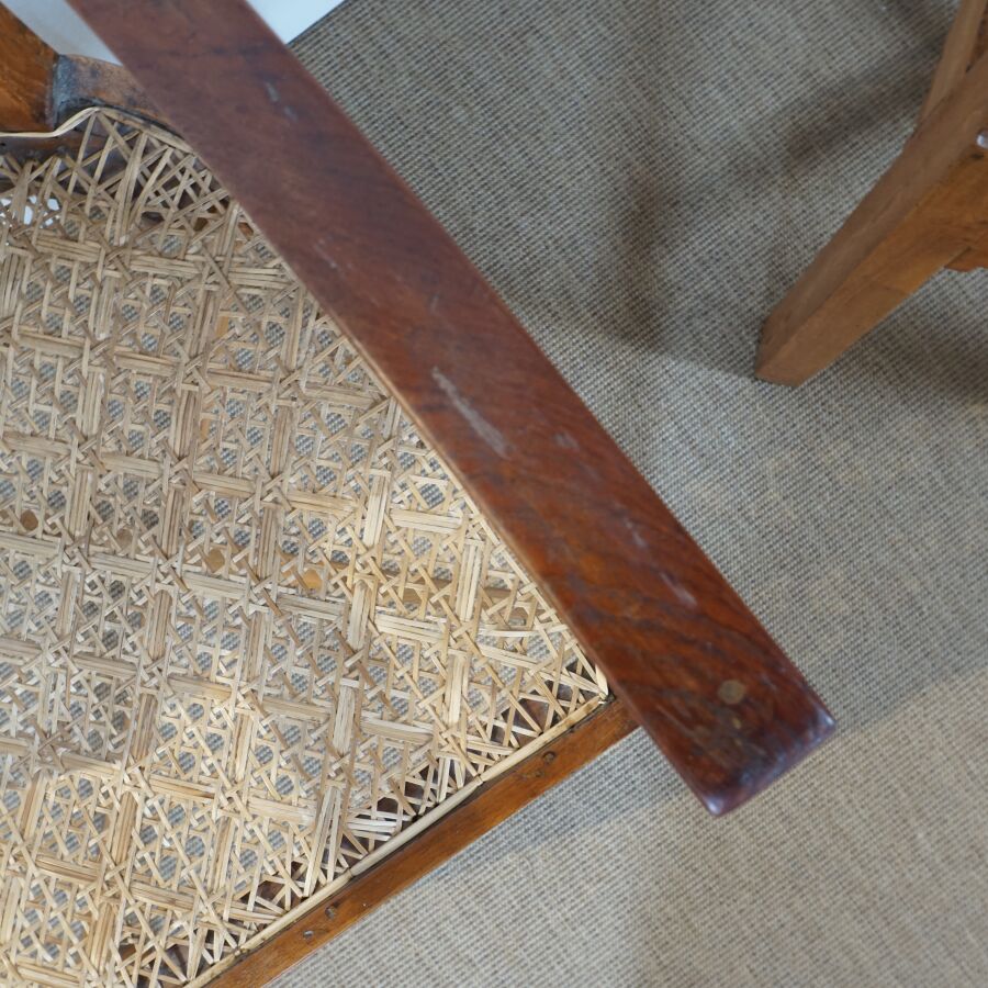 On joint un fauteuil similaire, dossier à bandeaux et assise cannée, travail de style colonial, H. 75.5 cm (usures).