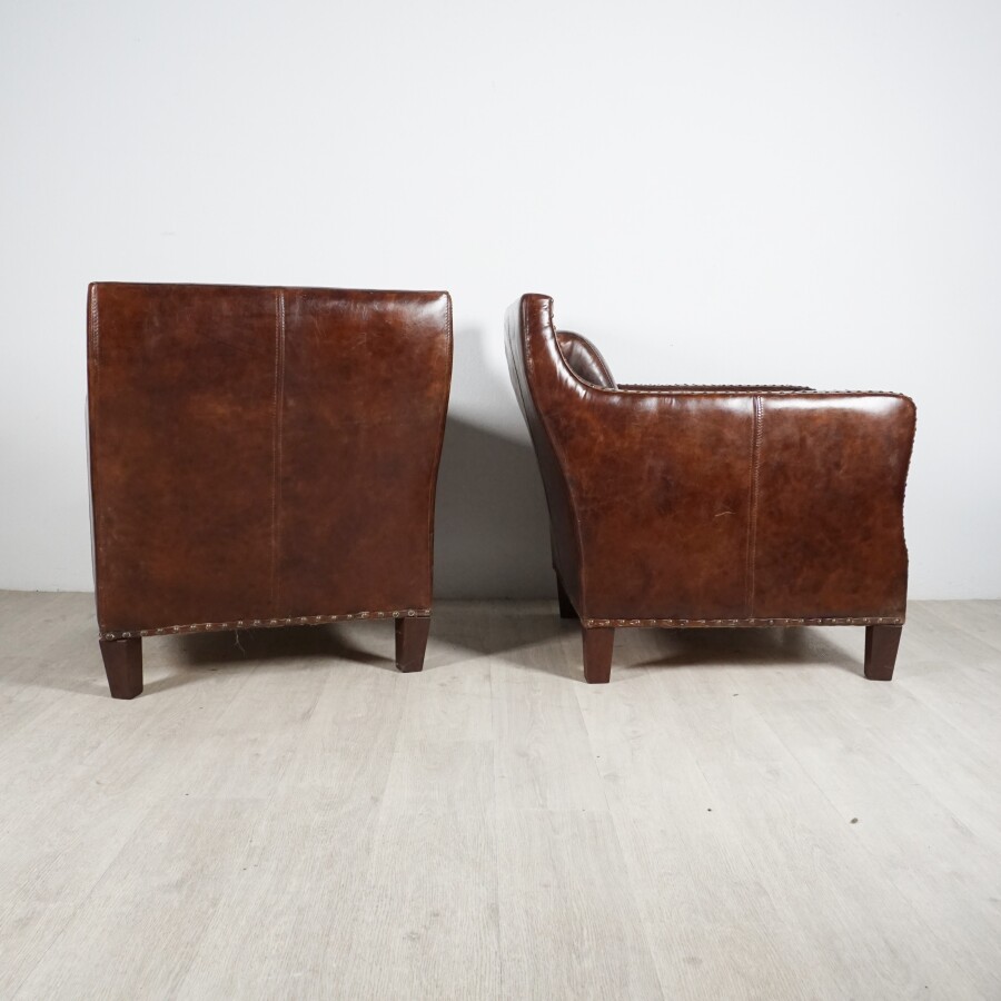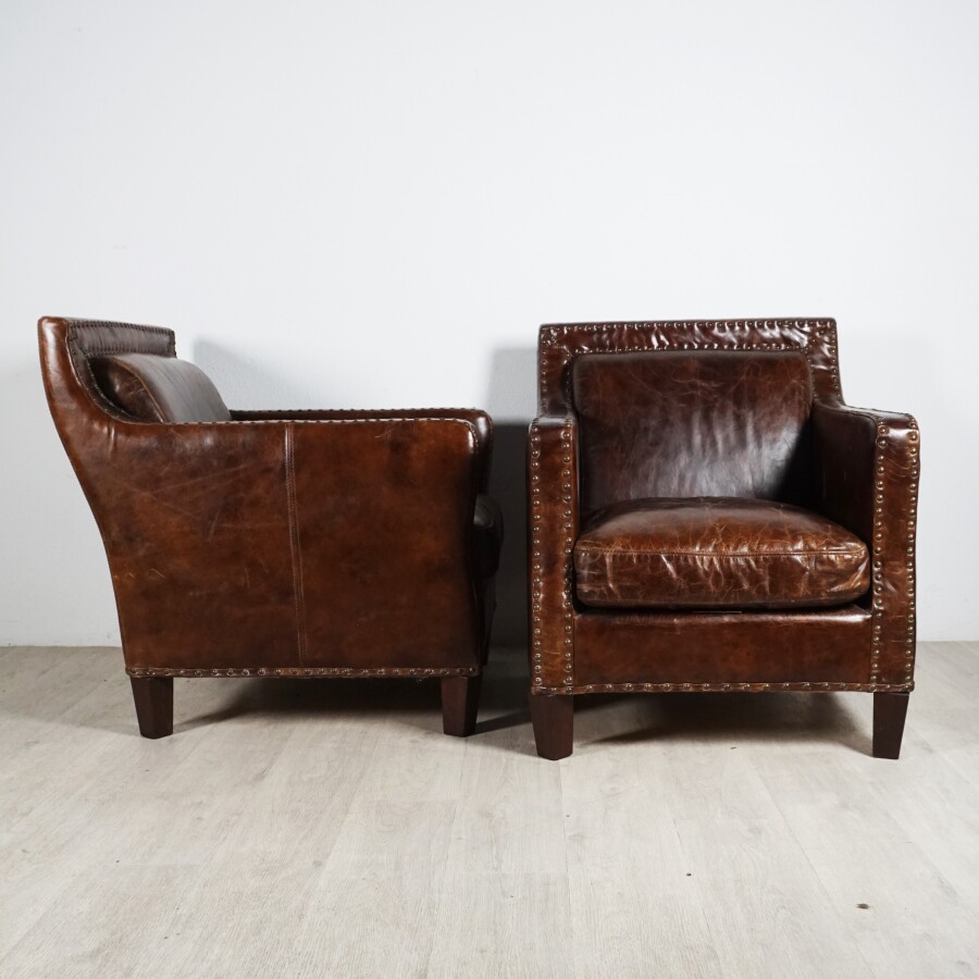 Paire de fauteuils style club, cuir marron et clou en métal, H. 78.5 cm x L. 67 cm x P. 77 cm (usures au cuir).