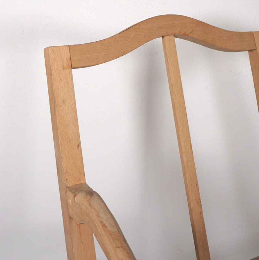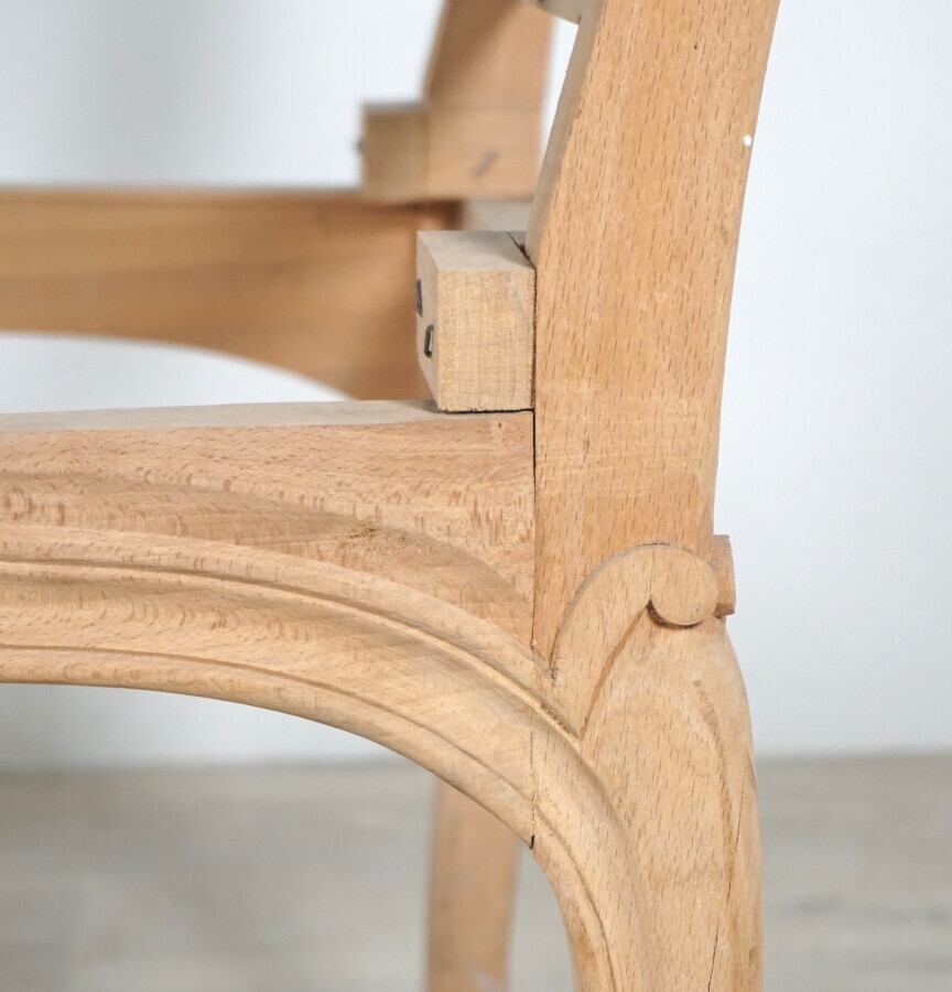 Paire de fûts de fauteuils à la reine de style Régence en hêtre mouluré et sculpté, les accotoirs et supports d'accotoirs nervurés en coup de fouet, reposant sur 4 pieds cambrés, 64 x 68 x H. 94 cm.