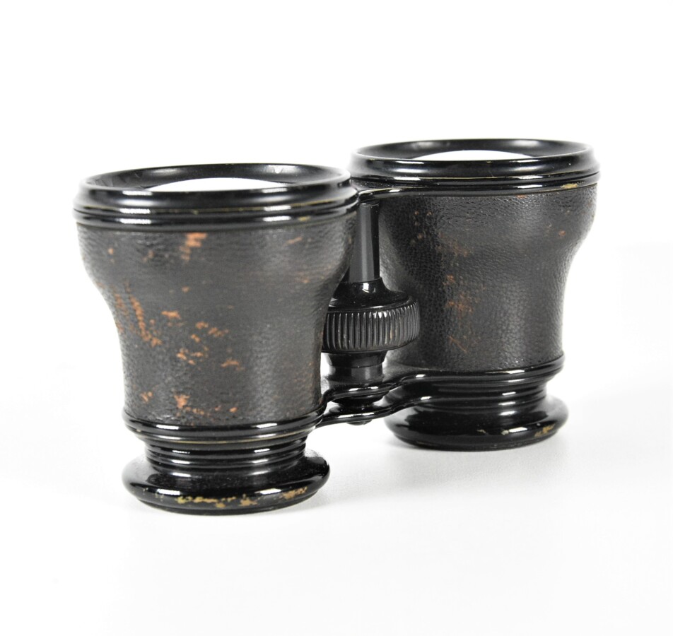 Paire de jumelles de voyage noire, dans leur étui en cuir noir, fermeture en métal doré ciselé, début du 20e (usures à l'étui).
