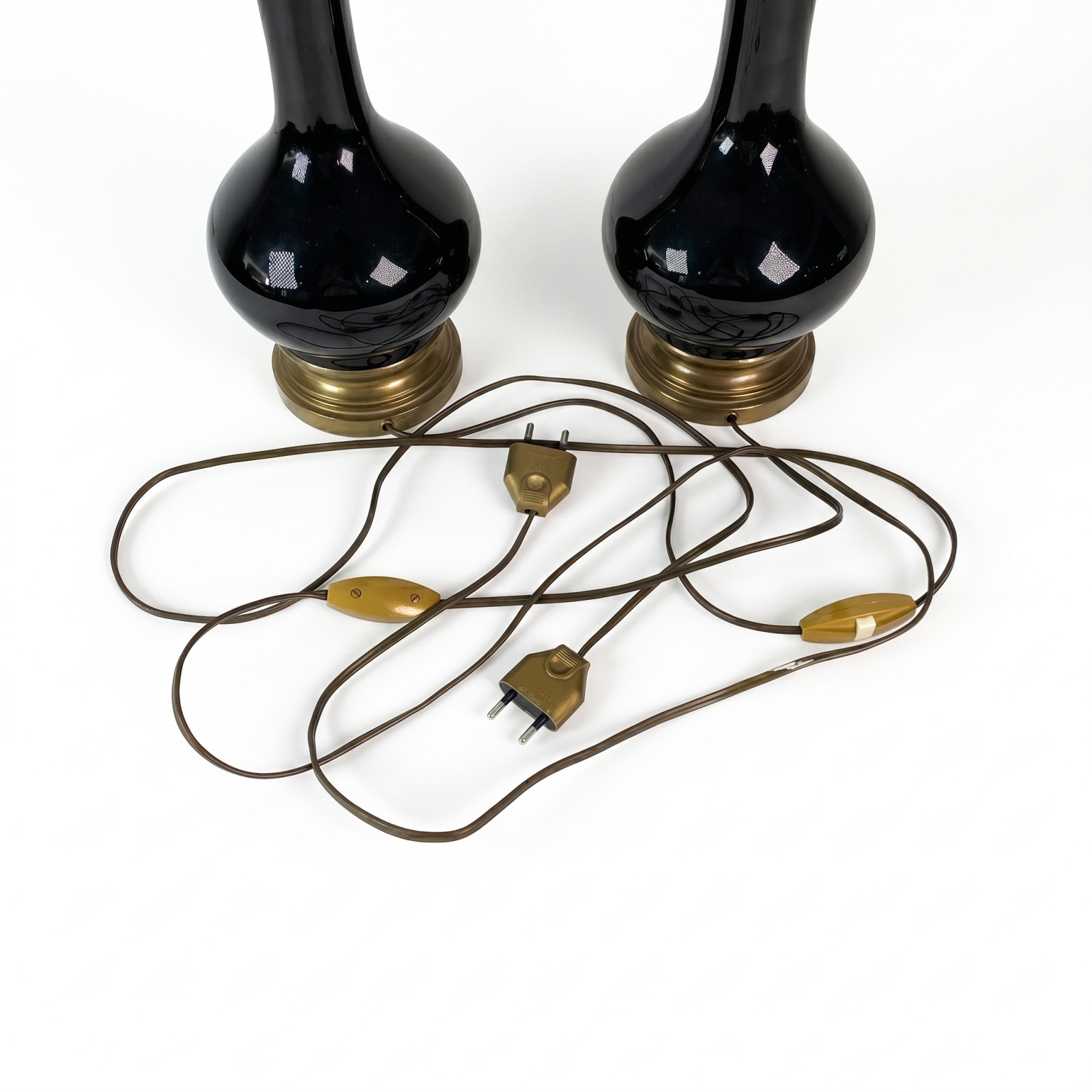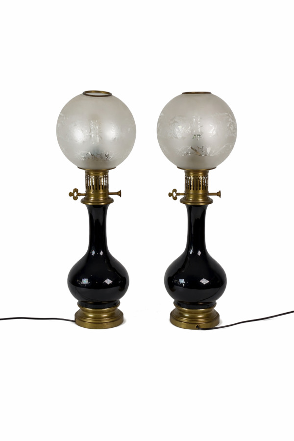 Paire de lampe à pétrole électrifiées Napoléon III, le corps en porcelaine noire, de forme balustre, la monture en laiton, accompagnée de leurs globes en verre. H. 51 cm (usures)