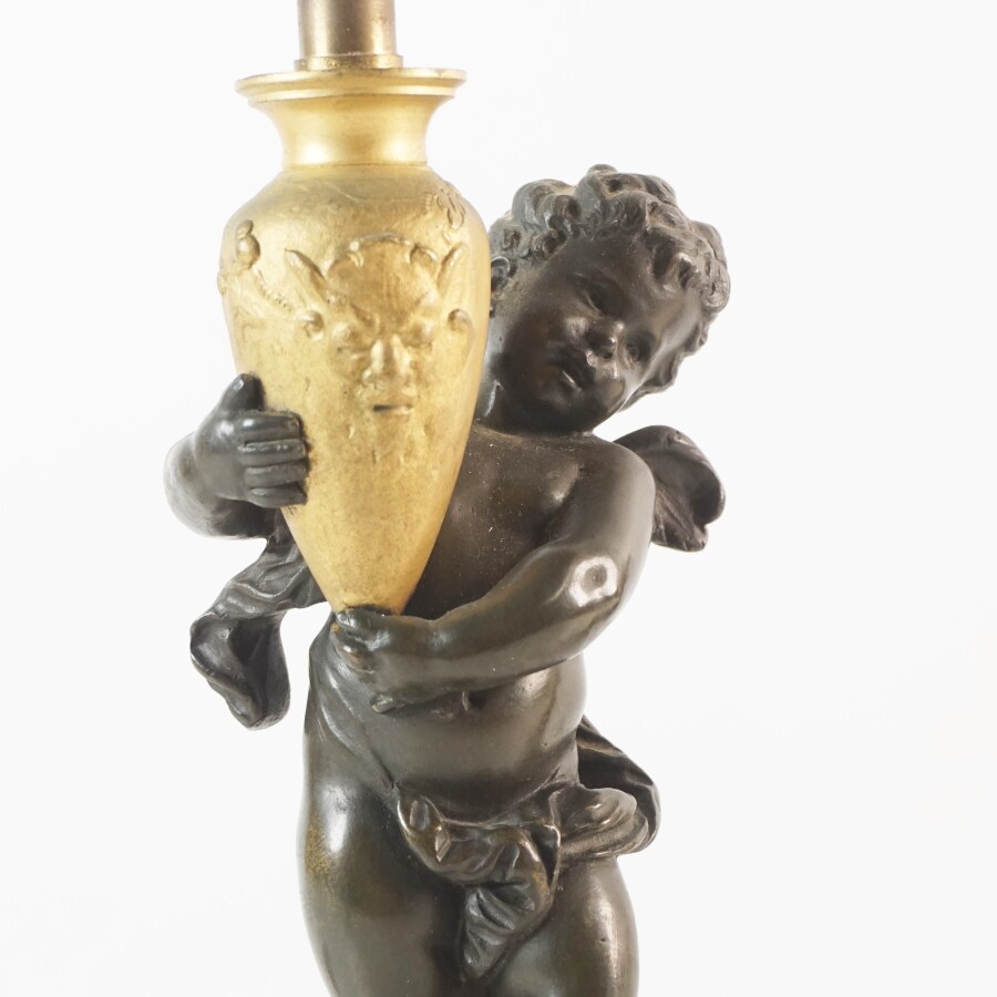 Paire de lampes, bronze à patine brune et doré, figurant des putti tenant des jarres feuillagées, reposant sur un socle en marbre blanc à pans coupés, ornés d'une frise de lauriers, 19ème siècle, H. 31 cm (légères oxydations).