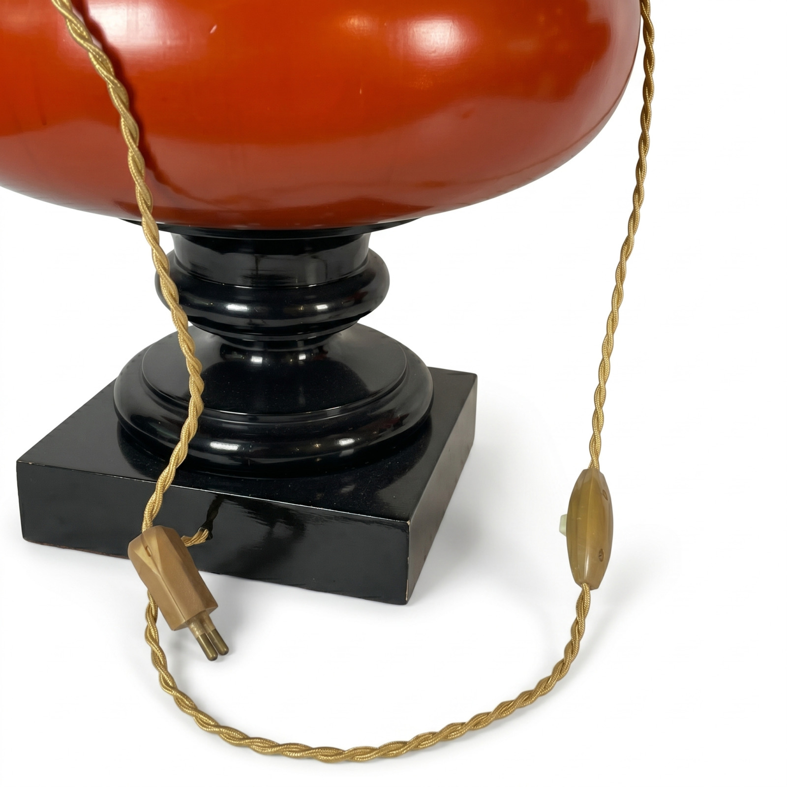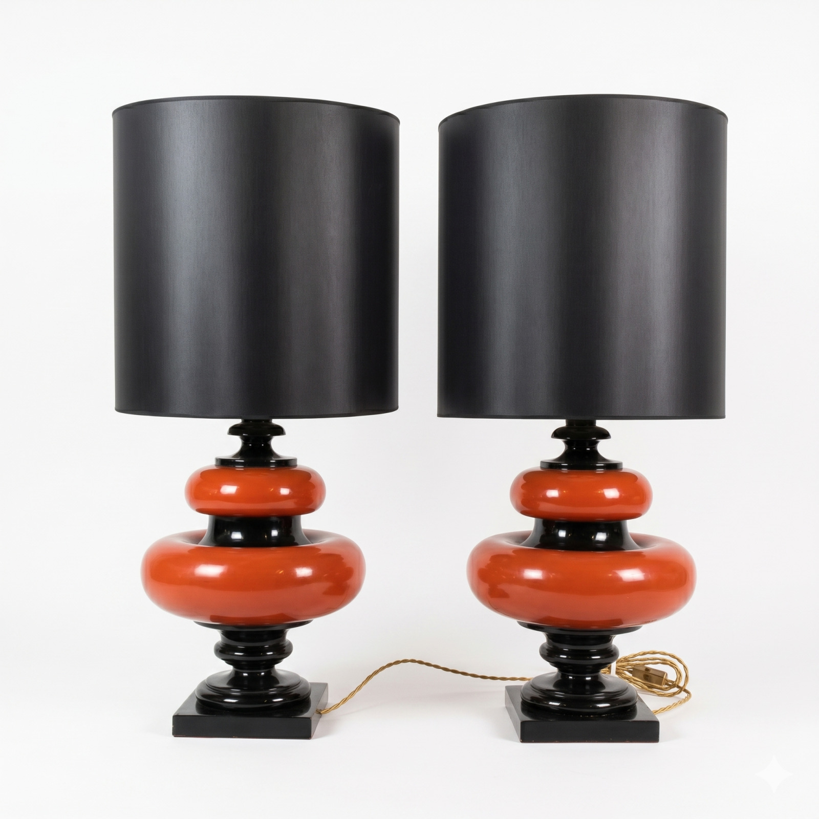 Paire de lampes design, le corps à double anneau en céramique émaillée brique, reposant sur un socle noir. H. 86 cm.