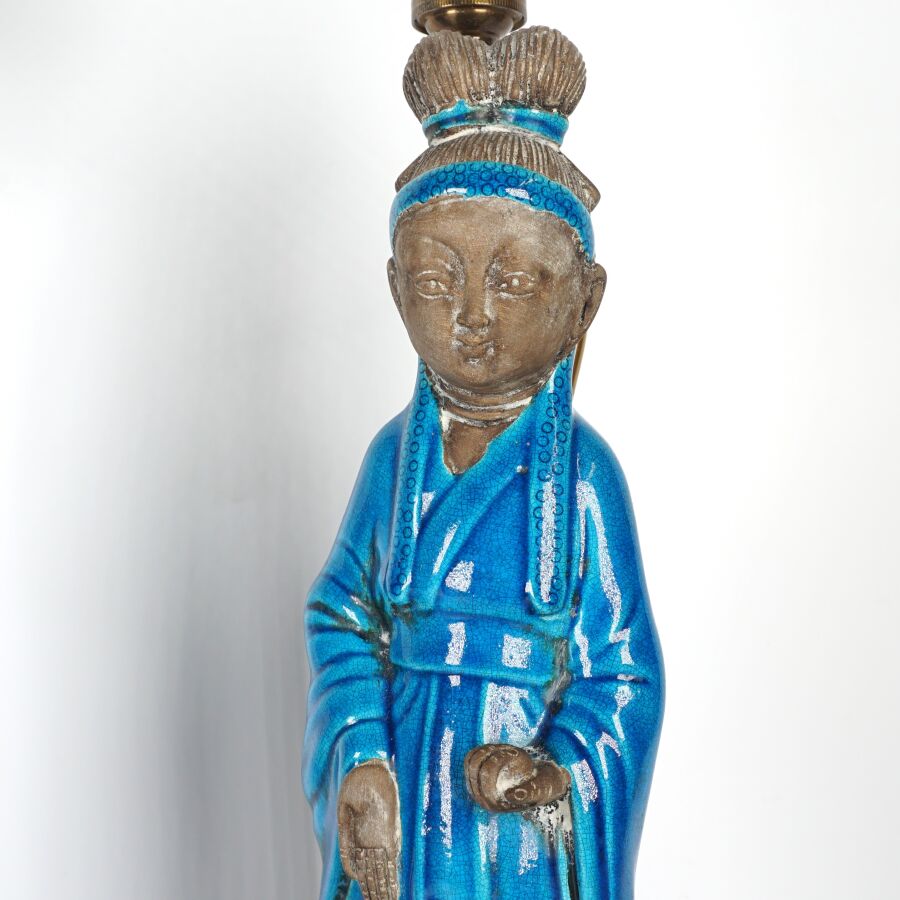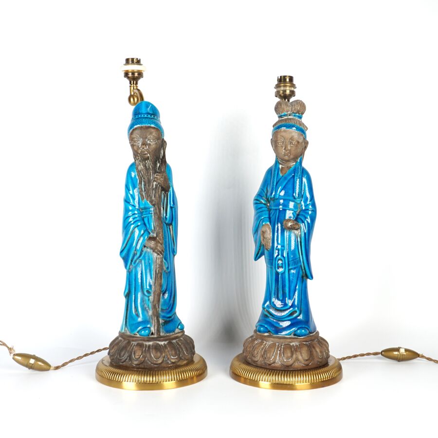 Paire de lampes électriques figurant un couple debout, vêtu de longs manteaux bleus émaillés, présentés sur une base circulaire en métal doré, ornée d'un décor godronné, Chine, travail décoratif moderne, H. Totale : 47 cm et 43 cm. H. Statuettes : 36.5 cm et 36.7 cm.