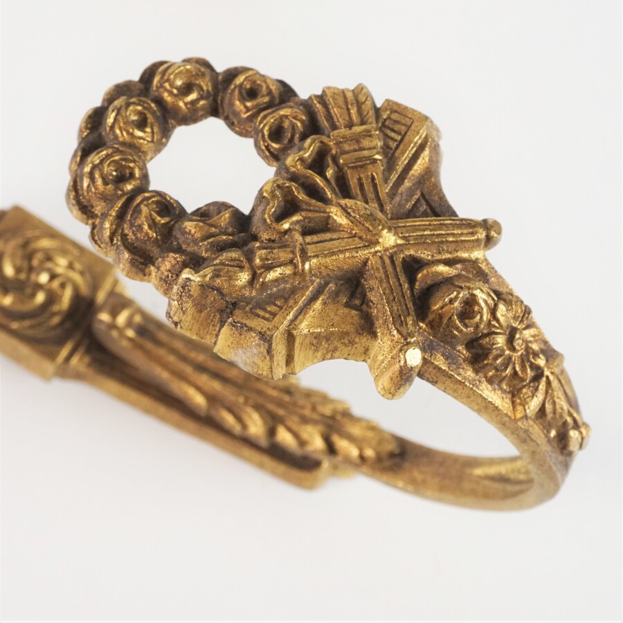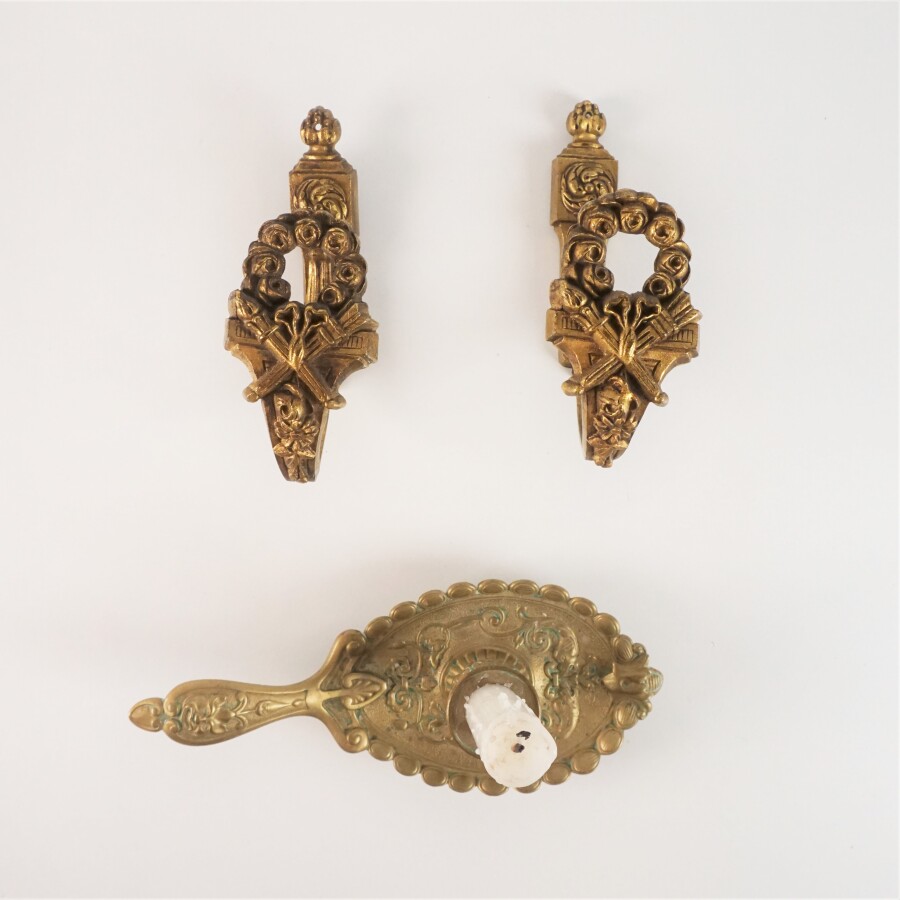 Paire de patères en laiton doré à décor de guirlandes de fleurs et de torches enflammées, H. 16 cm. On y joint un bougeoir à main, à décor de rinceaux feuillagés et la poignée figurant un masque, L. 32 cm (oxydations).