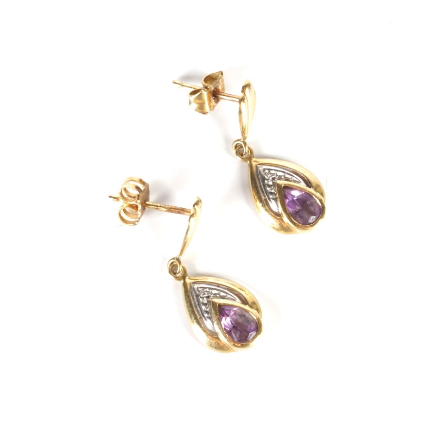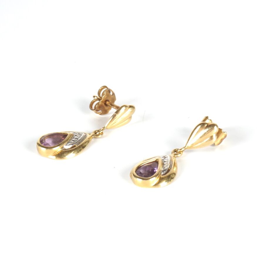 Paire de pendants d'oreilles articulés en or jaune 18K (750/oo) à motif d'une goutte sertie d'une améthyste de taille poire (D. 6 x 3.5 mm) surmonté d'un petit diamant rond, fermoir poussettes belges en or jaune 18K (750/oo), H. Totale : 2.3 cm. Poids brut : 2.2 g environ.