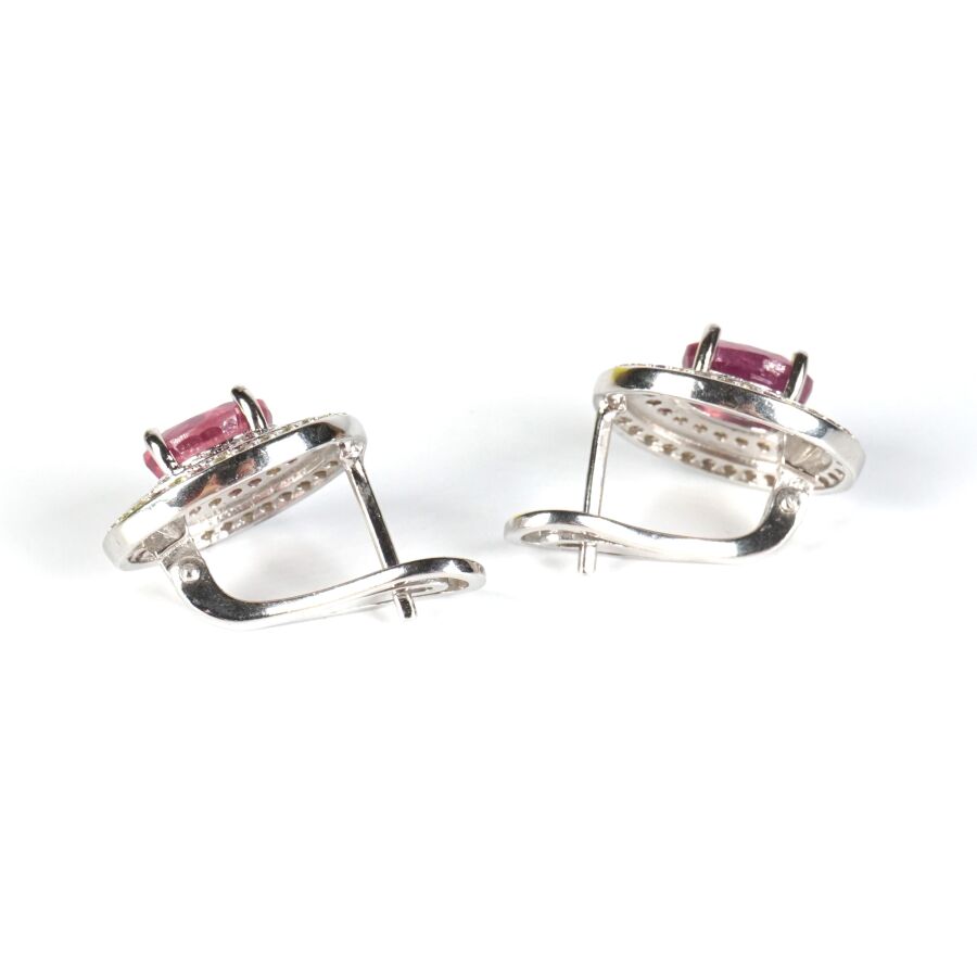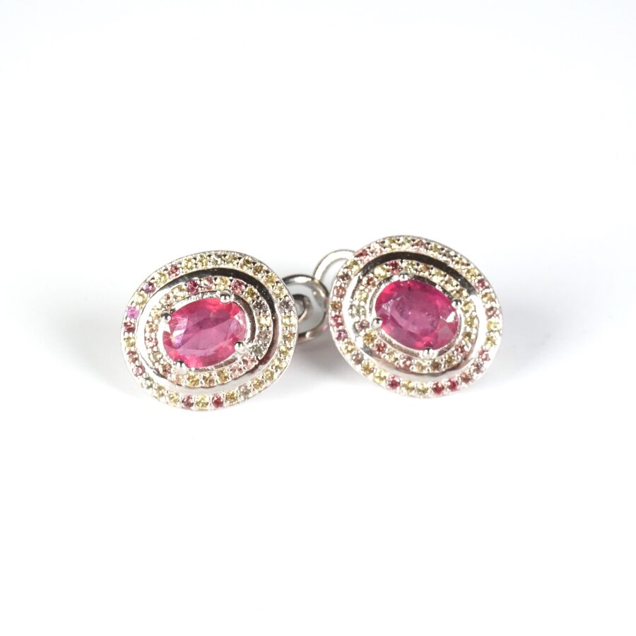 Paire de pendants d'oreilles en argent (925/oo) centrées d'une pierre rose, probablement un rubis (D. 8 x 6 mm), dans un entourage su deux lignes circulaires de saphirs et rubis, fermoir à cliquet, H. 1.7 cm. Dim. Motif. 1.5 x 1.7 cm. Poids brut : 7.4 g environ.
