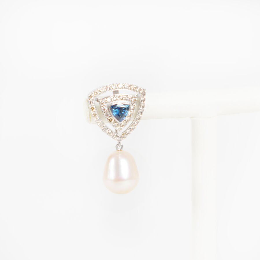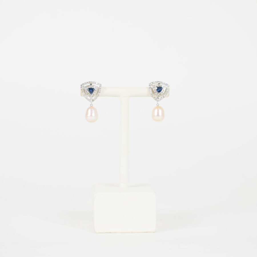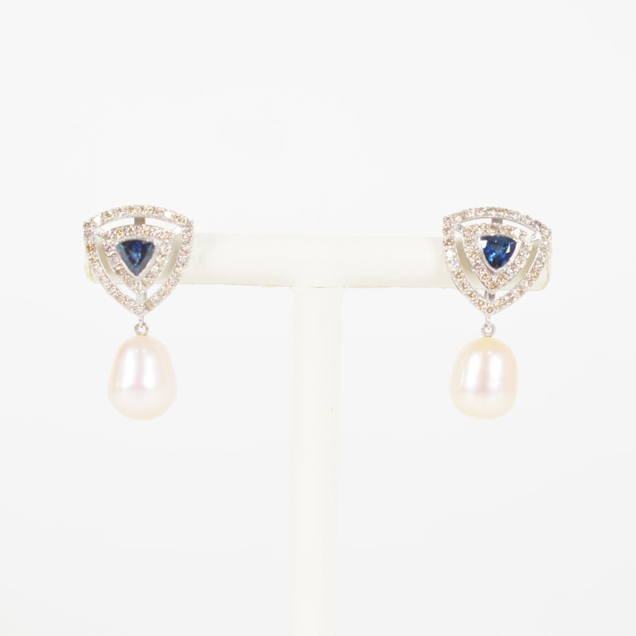 Paire de pendants d'oreilles en or 9K (375/oo) en forme de triangle, centrés de saphirs pour environ 0.6 ct, dans un double entourage de diamants, s'achevant sur une perle en pampille pour environ 12.3 ct, L. 24 mm. Poids brut : 4.7 g.