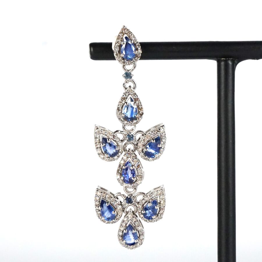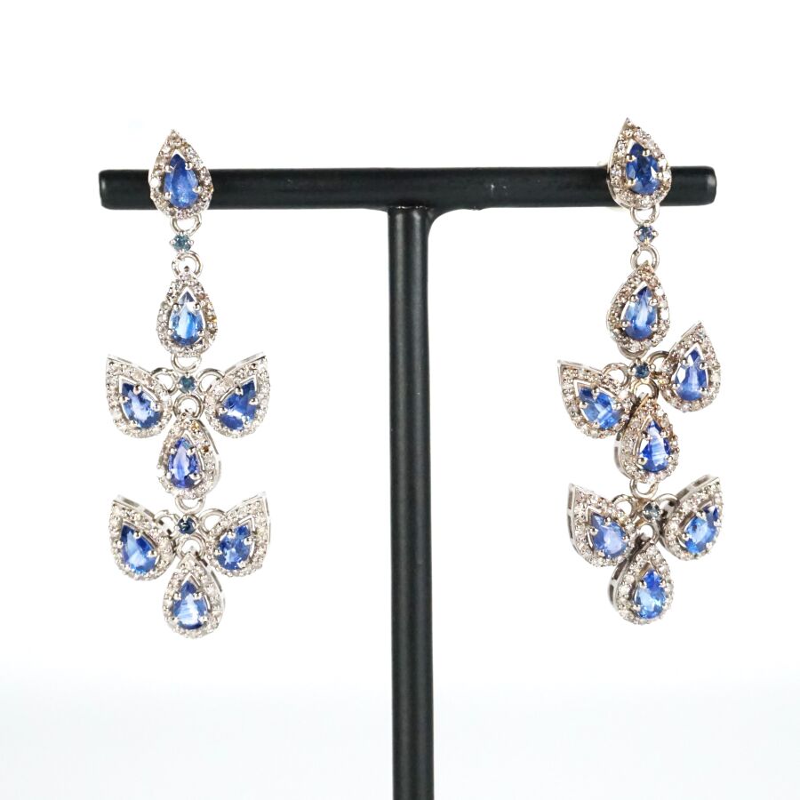 Paire de pendants d'oreilles en or gris (9K (375/oo), ornés de 8 pampilles retenant chacune un saphir bleu de taille poire (D. 5 x 3.5 mm) calibrant au total 4.5 cts environ, dans un entourage de petits diamants calibrant ensemble 1.3 cts environ, fermoirs poussettes belges, L. Totale : 4 cm. Larg. 1.5 cm. Poids brut : 9.2 g environ.