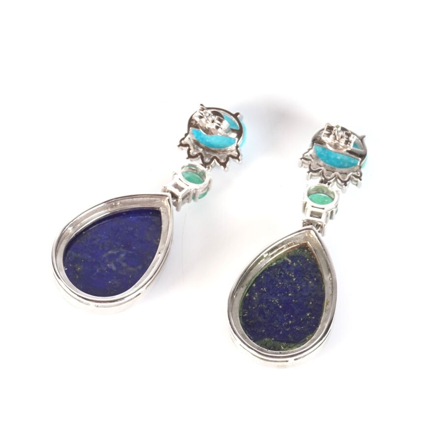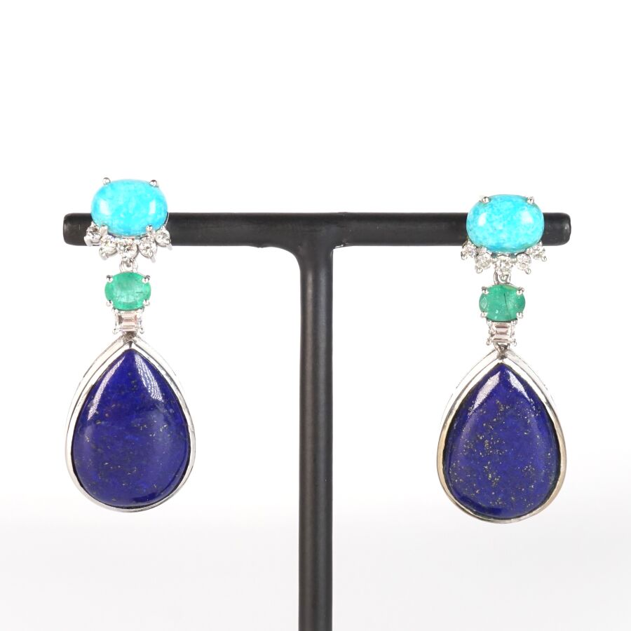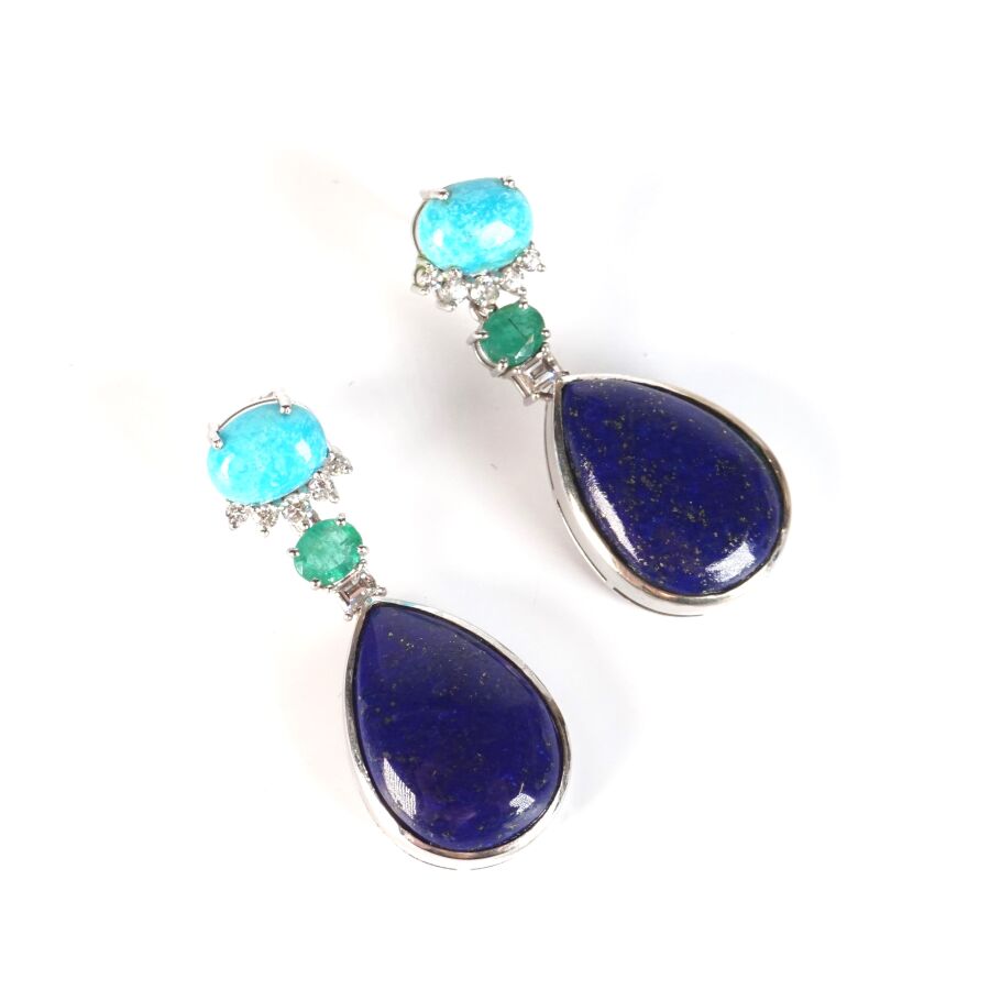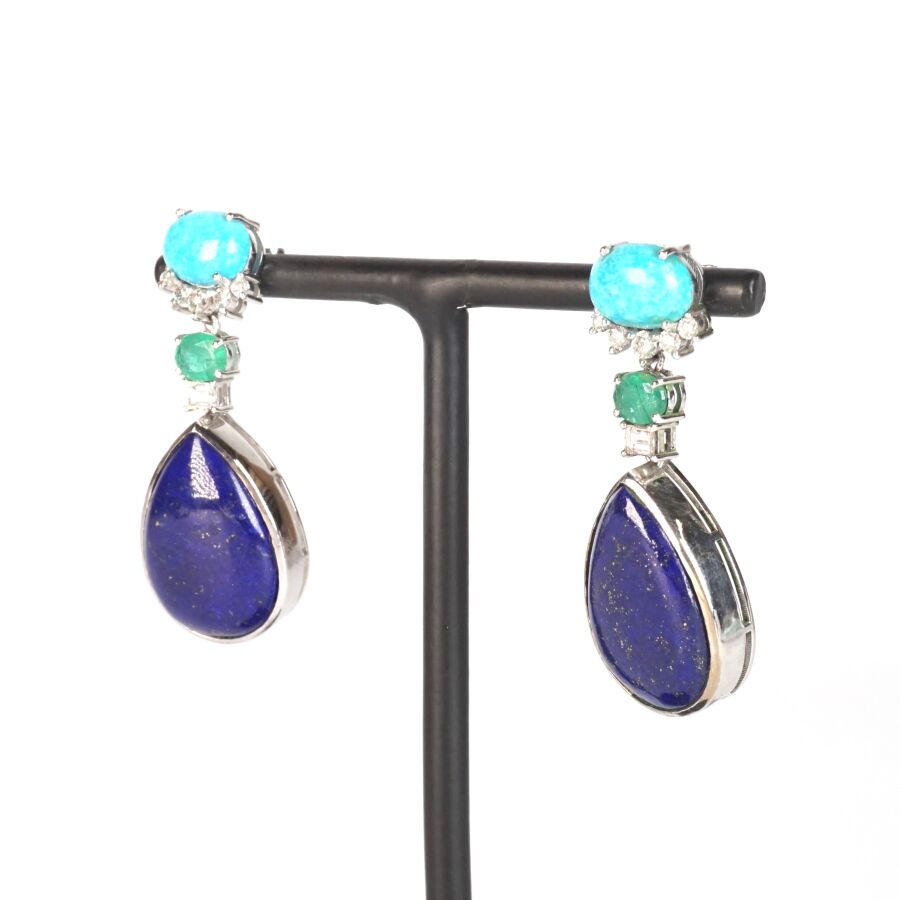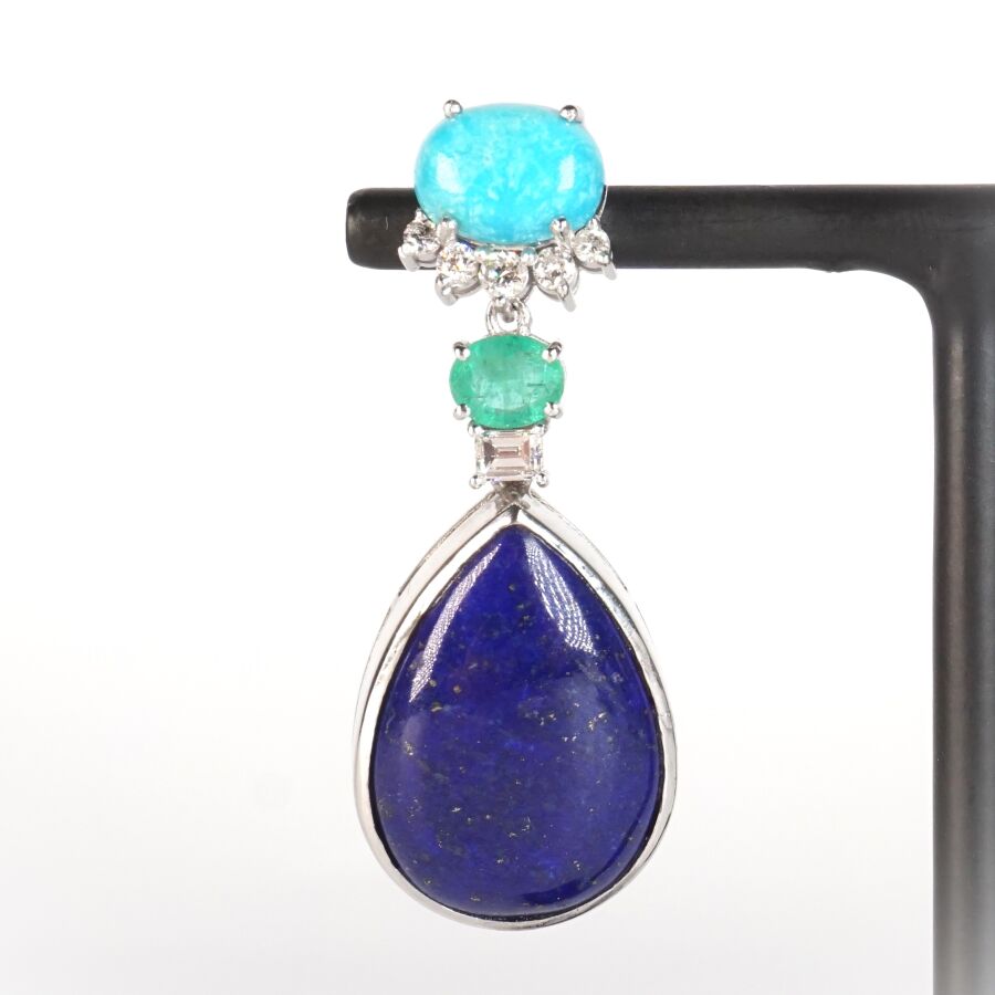 Paire de pendants d'oreilles en or gris 9K (375/oo) serties d'un cabochon de turquoise en serti griffe (D. 9 x 6 mm) soutenu de 5 petits diamants rond, retenant en pampille une émeraude de taille ovale (D. 5 x 4 mm), un diamant calibré et un lapis-lazuli de forme goutte, taille cabochon en serti clos (D. 1.8 x 1.35 cm), fermoirs poussettes, H. Totale : 3.8 cm. Poids brut : 12.3 g environ.