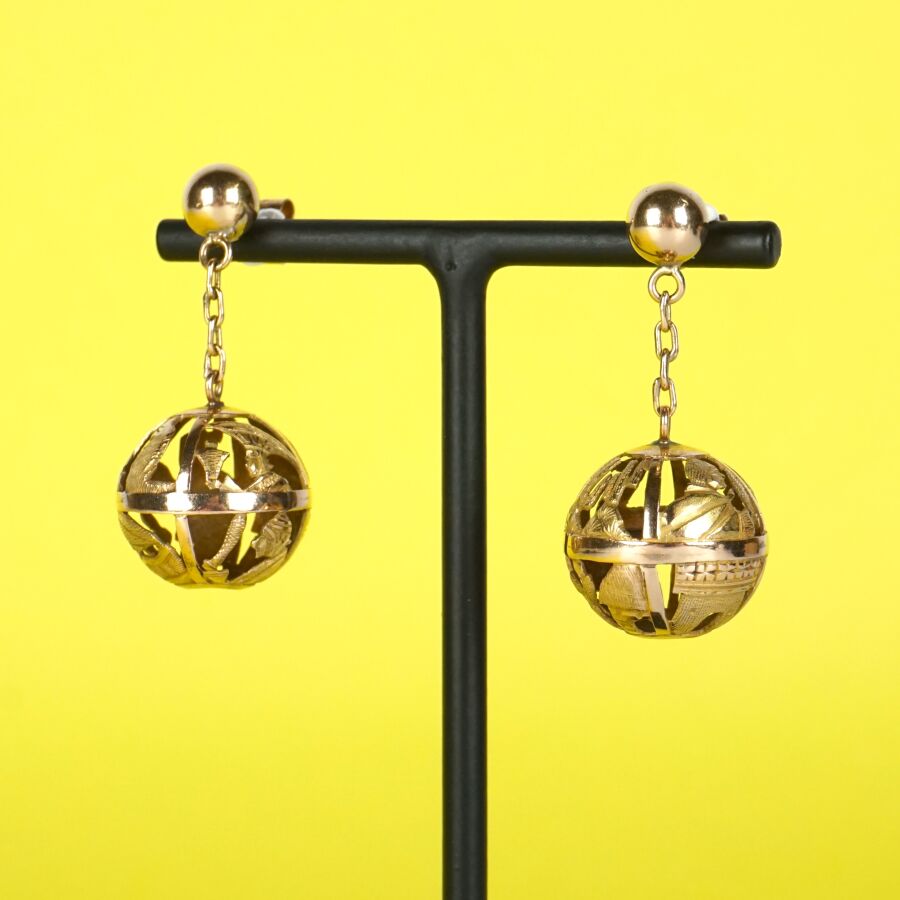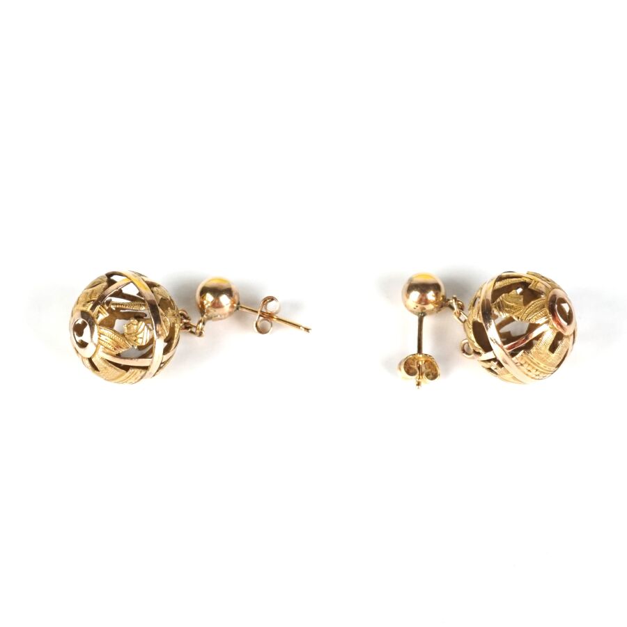 Paire de pendants d'oreilles en or jaune 14K (585/oo) ornées d'une boule d'or retenant par une petite chaîne maille forçat une sphère ajourée à motif de personnages et bateaux, fermoirs poussettes, Diam. Sphère : 1.8 cm. H. 3.8 cm. Poids brut : 8.6 g environ.