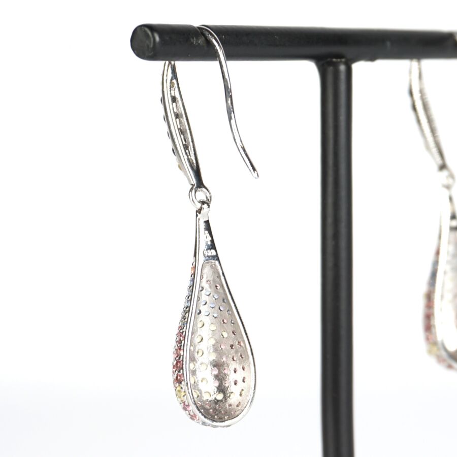 Paire de pendants d'oreilles "Goutte" en argent (925/oo), sertis de saphirs de couleur jaune, bleue et orange, le crochet serti de 8 saphirs, L. Totale : 4.3 cm. Larg. 9 mm. Poids brut : 4.9 g environ.